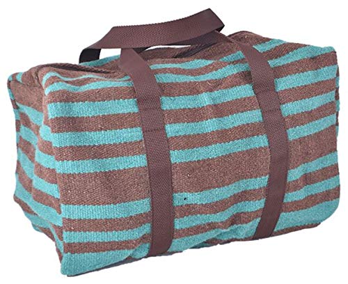 Showman Turquoise & Brown 100% Wool Serape Saddle Blanket Duffel Bag. This duffel bag is made of 100% wool serape saddle blanket with brown nylon handles. Bag is lined and features a zipper closure for privacy. Measures 17" x 13" x 12".