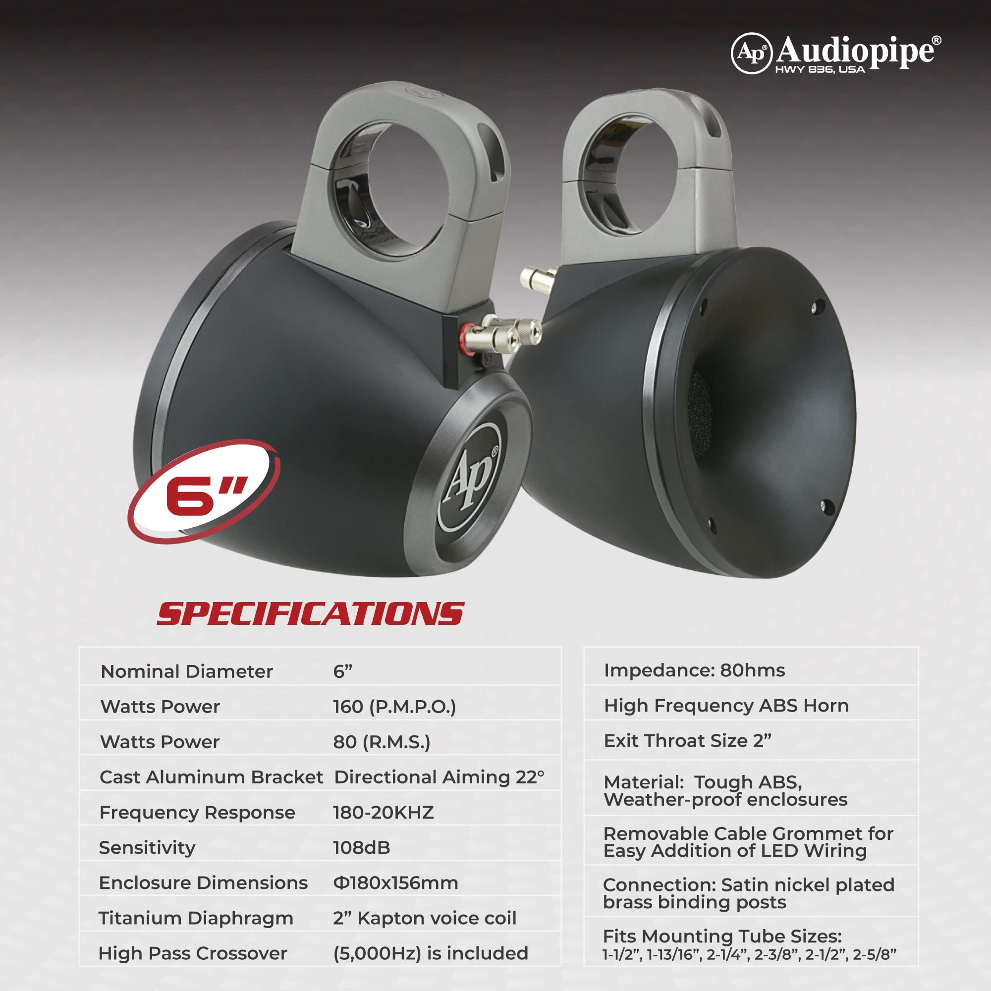 Experience superior sound on the water with the Audiopipe 6" 160W Marine Compression Driver Wakeboard Tower Speaker. Engineered to deliver exceptional audio clarity and power, this speaker is perfect for enhancing your boating adventures. Its robust 160W output ensures your music reaches every corner of your wakeboarding area, while the compression driver design provides crisp, clear sound. Built to withstand the marine environment, this speaker combines durability with top-notch performance, making it an ideal addition to your boat's audio system.