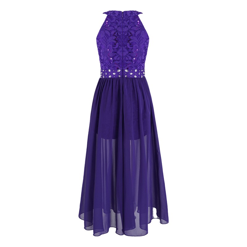 Sleeveless, round neckline, floral lace top bodice, rhinestone trim at the waist. Hidden back zipper closure.