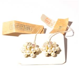 Pair of vintage Czech Bohemian faux pearl and AB crystal faceted glass hand beaded cluster clip earrings. With original Jablonex company paper tags. Super examples of Czech costume jewelry earrings in original, untouched condition.