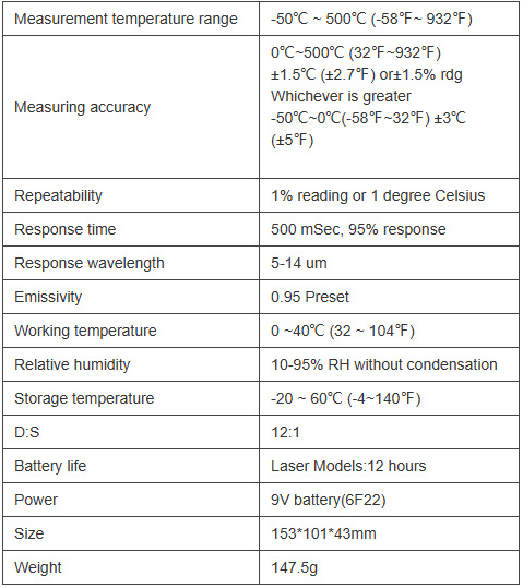 0.5°C/1°F 3°C/5°F 5.5°C/10°F Scanning function for locating a hot spot Automatic power off on 15 seconds of no operation