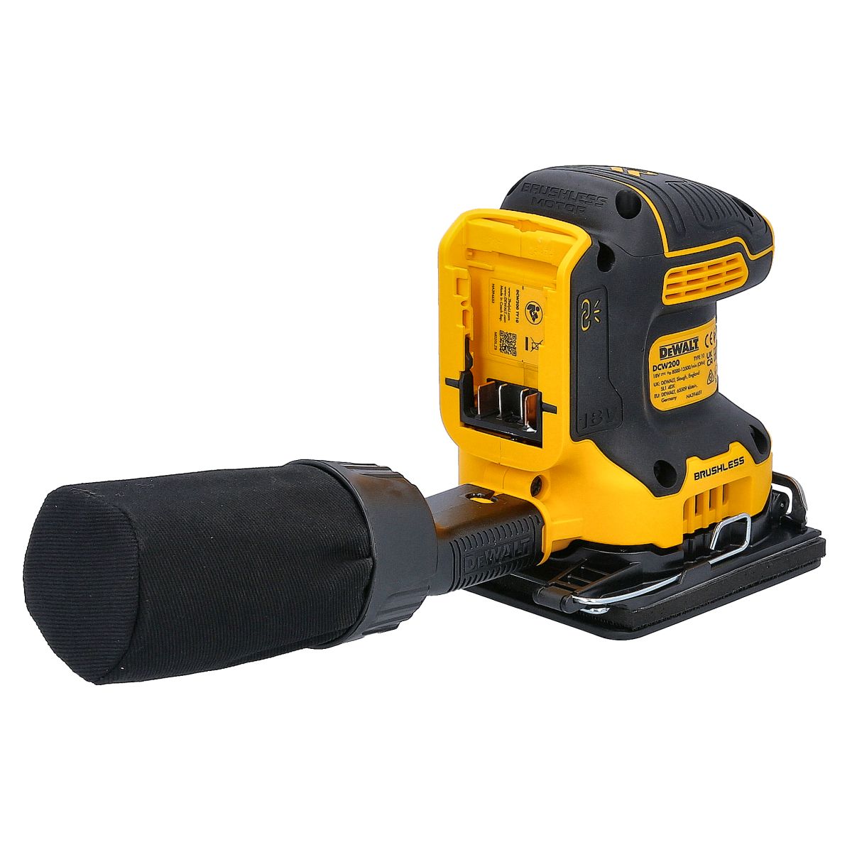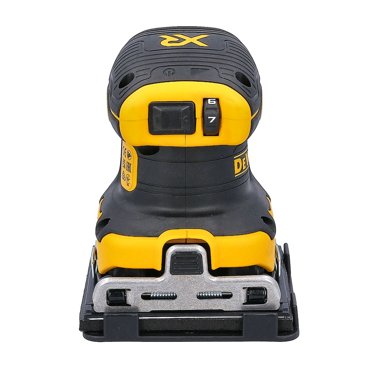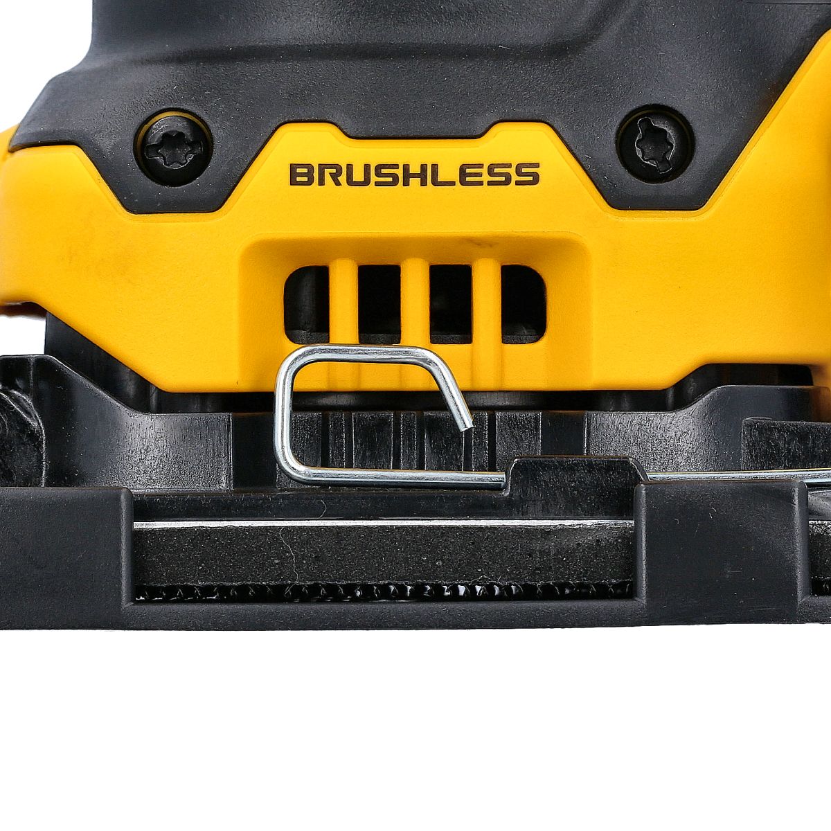 The DeWalt 18v Brushless 1/4" Sheet Sander offers more user freedom with the power & runtime needed to get a job done. The textured anti-slip top & body grip provides ultimate comfort & control during use & the dust-sealed switch prevents contamination. This sander uses hook & loop paper for consistent adhesion & fast changing of sanding sheets. The variable, seven-speed dial offers speed control from 8,000 - 13,500 OPM, allowing users to match the sander's speed to their application. Comes With
