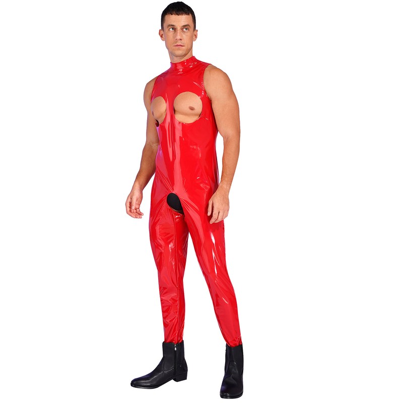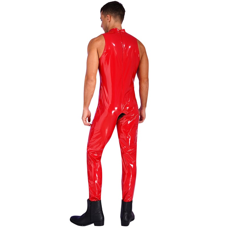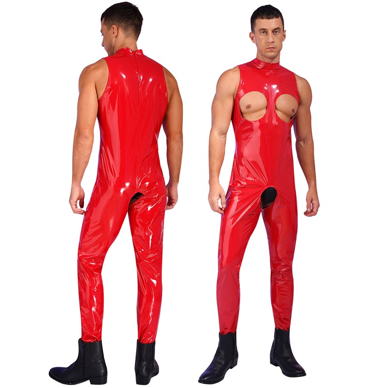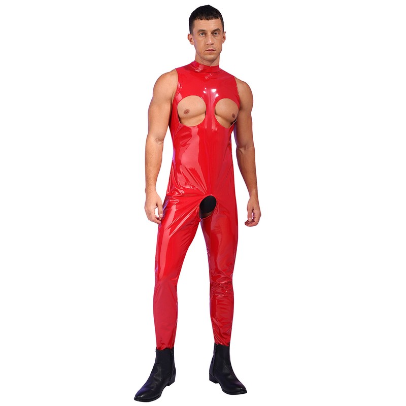 Open cups patent leather crotchless bodysuit mock neck sleeveless skinny jumpsuits for men.