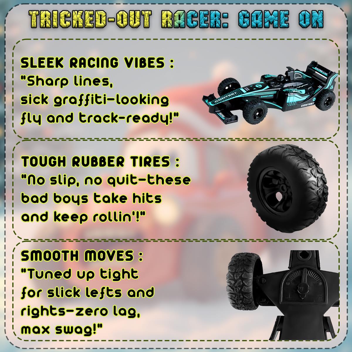 Indoor and Outdoor Fun: Whether racing indoors or outside, this car is designed to perform on a variety of surfaces, including carpet, tile, concrete, and asphalt.