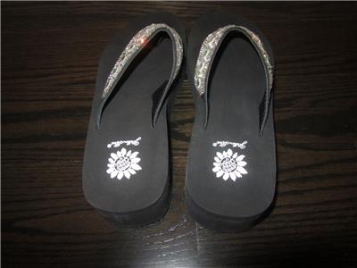 Gleam and glow in the lovely Rise sandal. Featuring a soft EVA footbed and embellished with the most beautiful multi-faceted and shaped jewels and rhinestones, the Rise is sure to make you sparkle and shine! Rise Flip Flops take casual to the next level with platform wedge heels, cushioned footbed and jewel embellished uppers. Superior comfort with Yellow Box's foam footbed construction