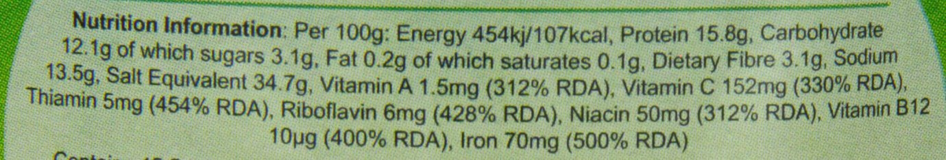 Hydrolysed SOYA and Maize Protein. Water. Vegetable Powder 10% (CELERY, Onion, Parsley, Spinach, barlic). Yeast Extract. Tomato Powder. Red Pepper Extract. Carrot extract. Kelp. Ferrous Sulphate, Vitamin C, Niacin, Beta Carotene, Ground Black Pepper, Riboflavin, Thiamin. Vitamin B12.