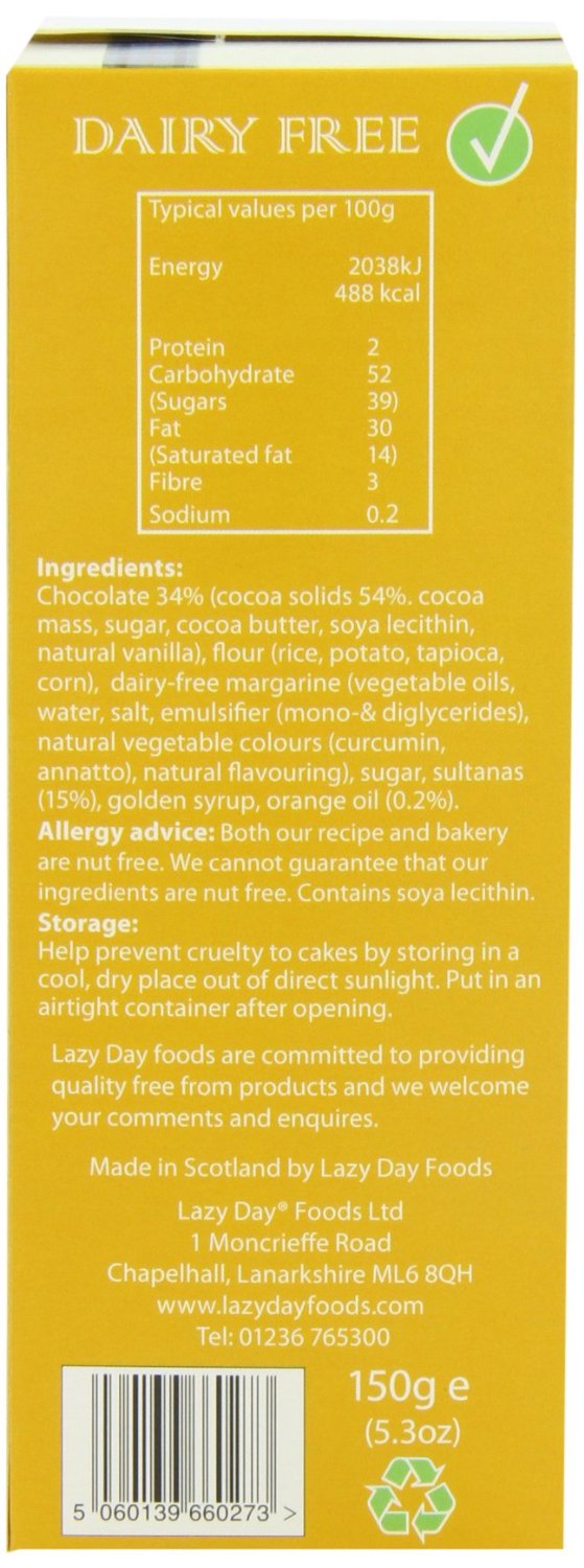 Chocolate (34%) [cocoa solids (55%. cocoa mass, sugar, cocoa butter, SOYA lecithin, natural vanilla)], flour (rice, tapioca, corn), dairy-free margarine [palm oil*, rape seed oil, water, salt, emulsifier (mono-& diglycerides), natural vegetable colours (curcumin and annatto), natural flavouring], sugar, sultanas (15%), golden syrup, orange oil (0.2%), SOYA lecithin. *Palm oil is RSPO certified.