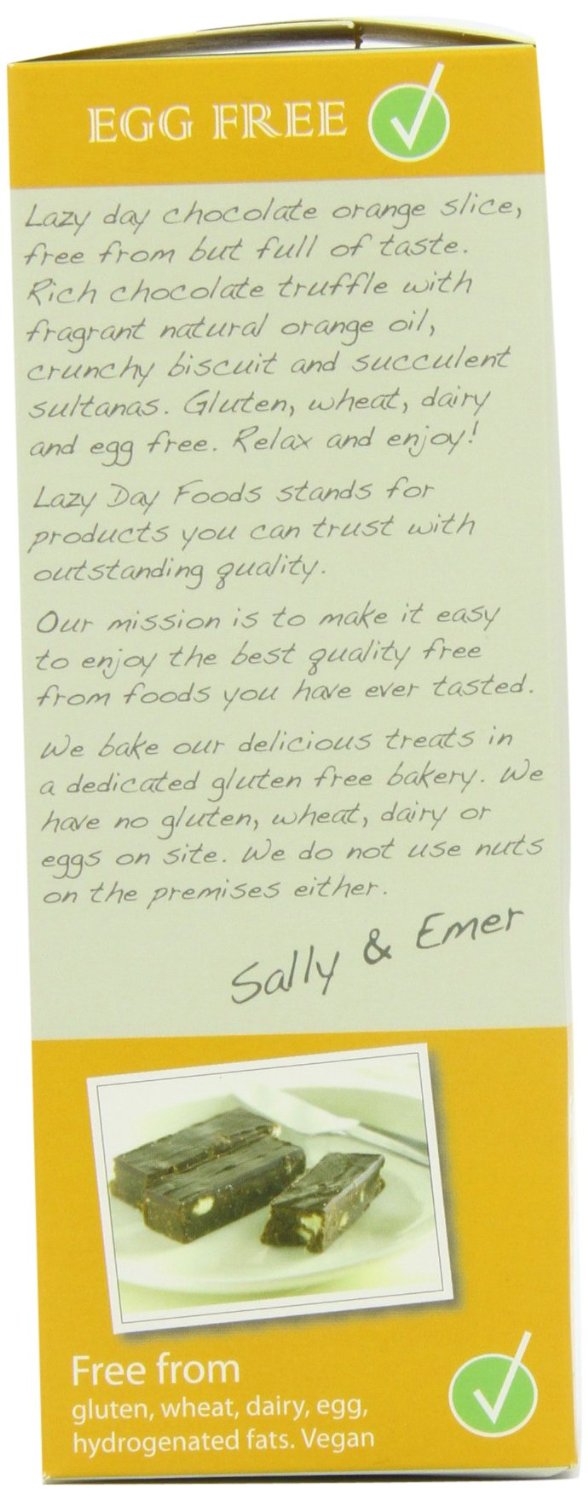 Lazy Day Foods Belgian Dark Chocolate Tiffin Slices flavoured with natural orange oil. Containing pieces of shortbread and succulent sultanas, topped with a layer of Belgian dark chocolate. It is free from gluten, wheat, dairy, lactose. It is suitable for coeliac and vegans.