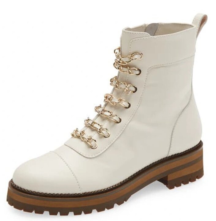 Glimmering chains embellish the vamp of a combat-inspired boot in an easy side-zip style grounded by a lugged sole.