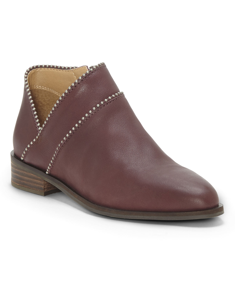 Lucky Brand Perrma Raisin Curved Topline Pinpoint Studed Moto Edge Bootie Pinpoint studs highlight the curved topline of an abbreviated bootie that exemplifies moto edginess.