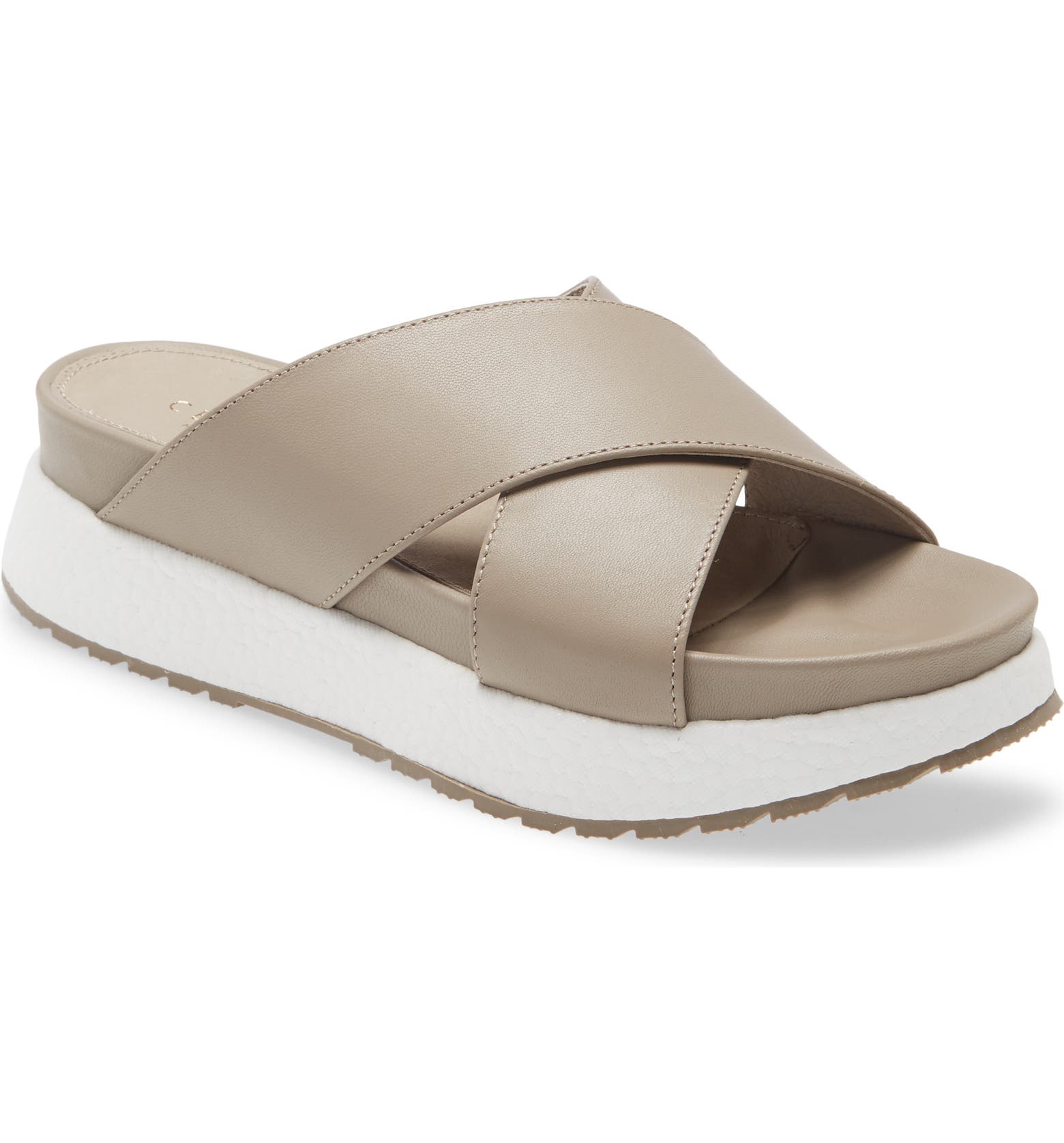 A sporty platform elevates this slide sandal that's lined with breathable leather and topped with crisscrossing vamp straps.
