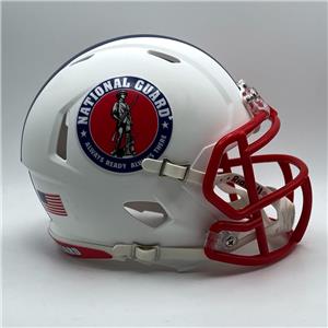 US National Guard CUSTOM Concept Matte White Mini Football Helmet. These helmets are made with ABS plastic helmet shells and a plastic face mask. Realistic interior foam padding, vinyl-leather chin strap. Mini Helmets are a 1/2 scale versions of full size football helmets. These mini helmets measure 6"(L), 4½"(W), 5"(H) - (NOT FOR WEARING). This is not an officially licensed product, it is a custom concept helmet.