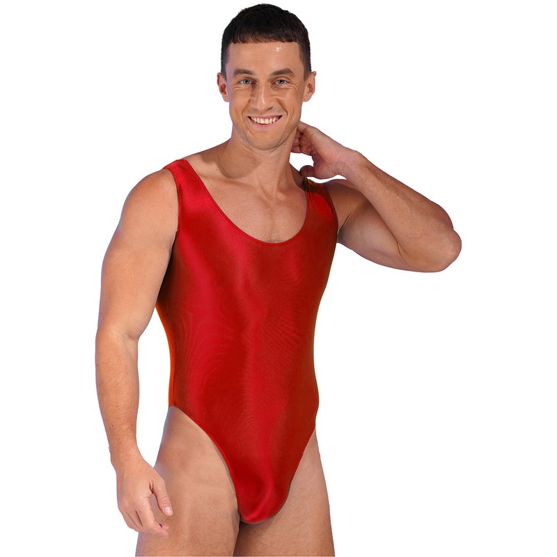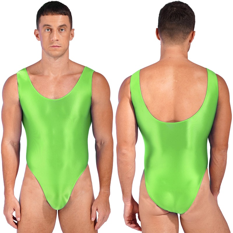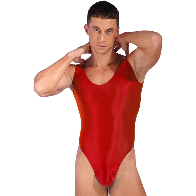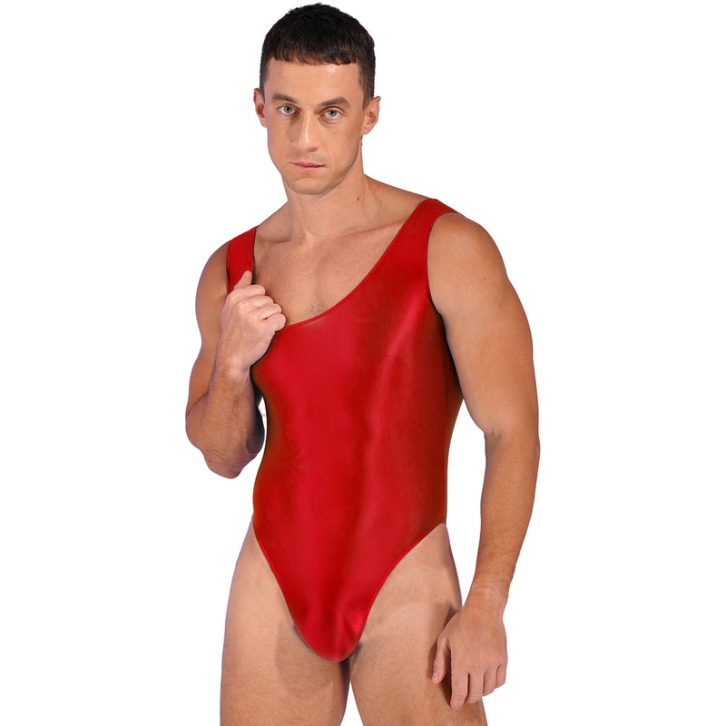 Glossy bodysuit for men, solid color, u neck, sleeveless, high cut design show off your strong legs.