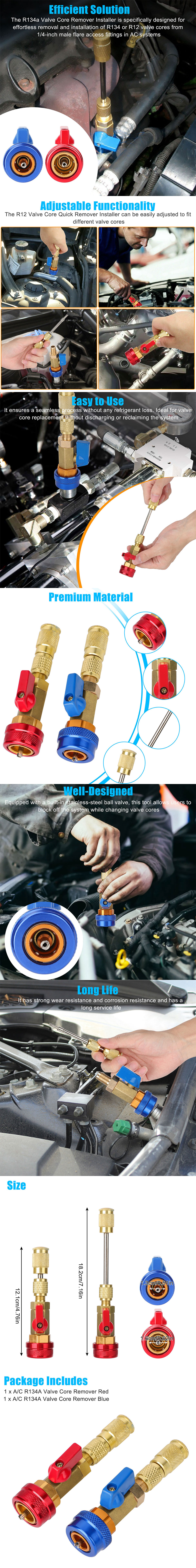 Efficient Solution: The R134a Valve Core Remover Installer is specifically designed for effortless removal and installation of R134 or R12 valve cores from 1/4-inch male flare access fittings in AC systems. It ensures a seamless process without any loss. Ideal for valve core replacement without discharging or reclaiming the system.