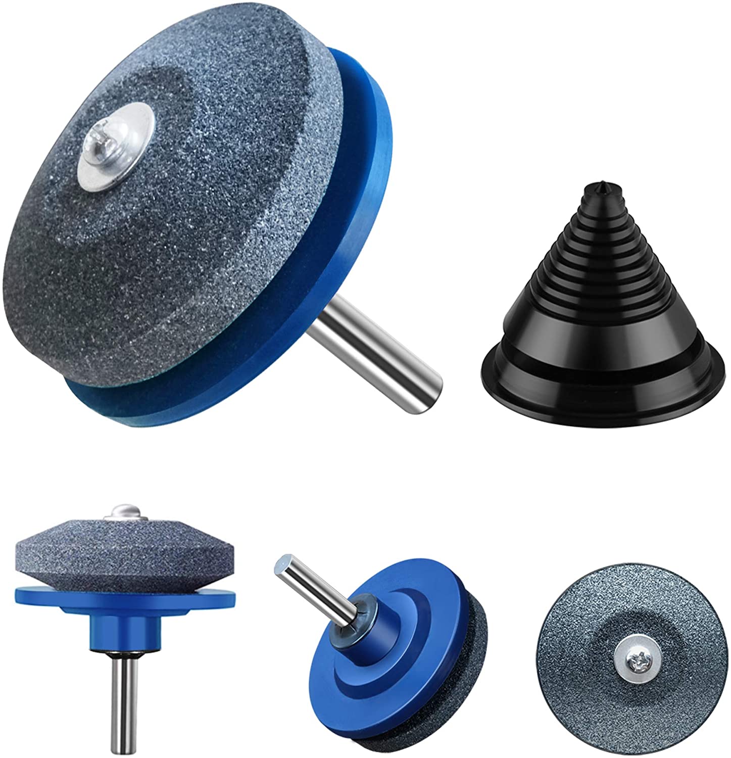5 Pack Lawn Mower Blade Sharpener Set for Power & Hand Drill Grinding Garden Tool - 4 x Sharpening Stones, 1 x Balancer