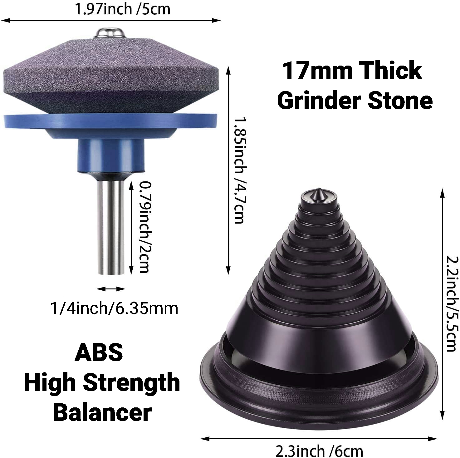 Material of Grinder Stone: White Fused Alumina Material of Shank: Steel, Nickel-Plated Material of Balancer: ABS High Strength Plastic Grinder Stone Size: 50 x 47 mm Grinder Stone Thick: 17 mm Shank Size: 1/4 in, 6.35 mm Balancer Size: 60 x 55 mm