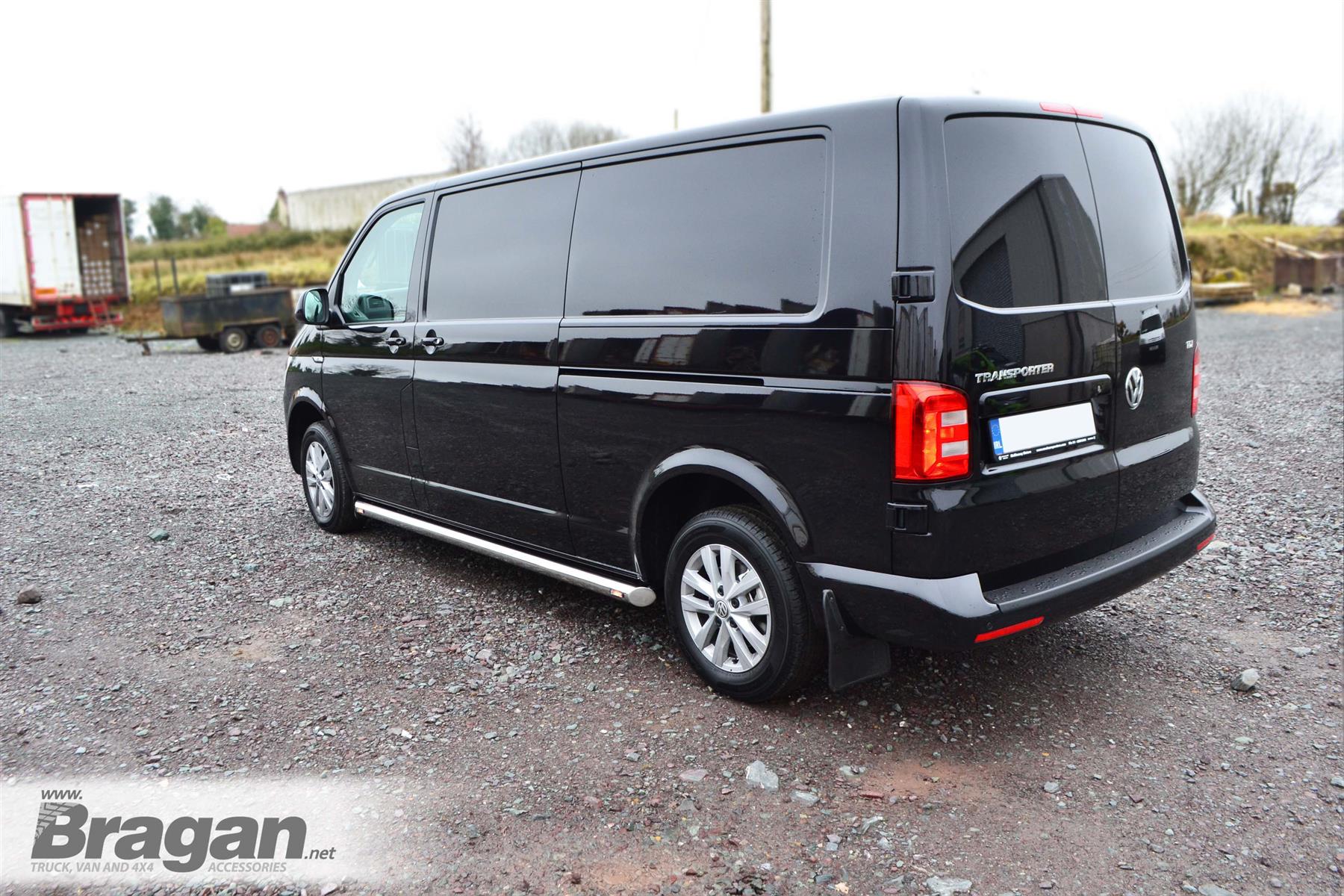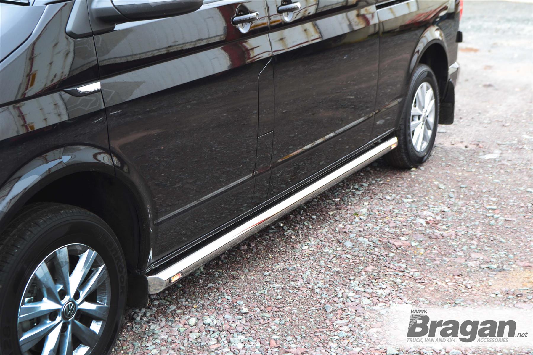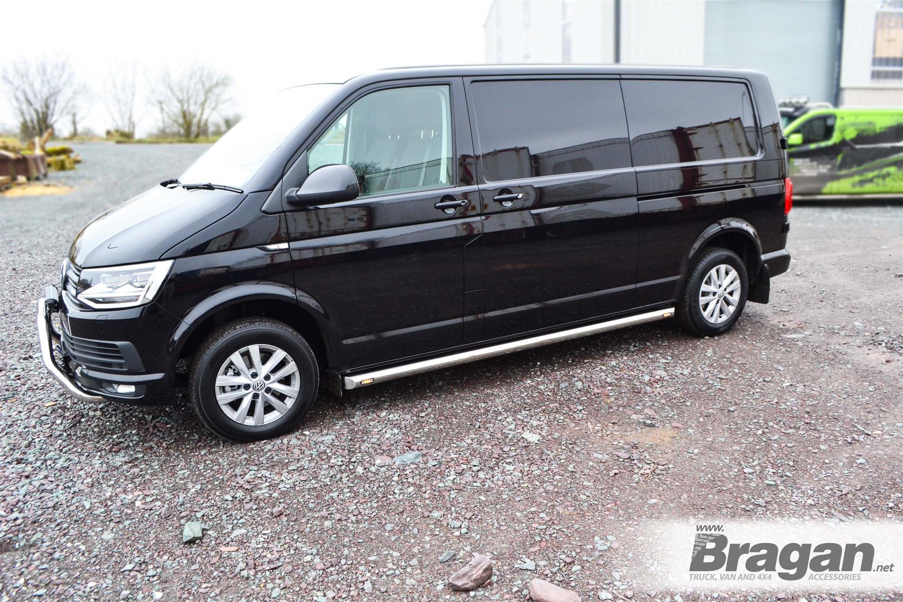 High-quality Stainless Steel Side Bars - set of 2 (Pair) with Amber LEDs x4 for Volkswagen Transporter T5 / Caravelle LWB (2004 - 2015 model). This sale is for 2 sidebars.