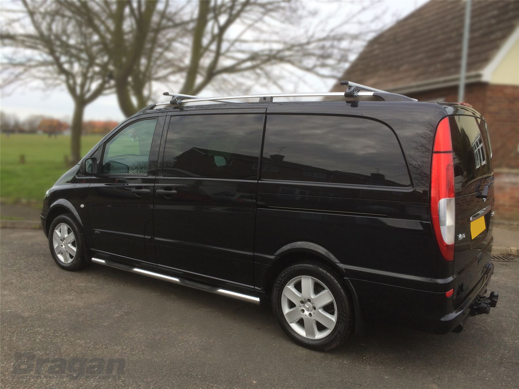 High quality Aluminium Roof Rails set of 2 (Pair) with Locking Cross Bars set of 2 (Pair) and Heavy Duty Load Stops For Mercedes Vito / Viano ELWB (2004 - 2014 model). These top of the range roof rails with cross bars and load stops will have your vehicle looking top spec at a fraction of the cost of the genuine items but with the same high quality.