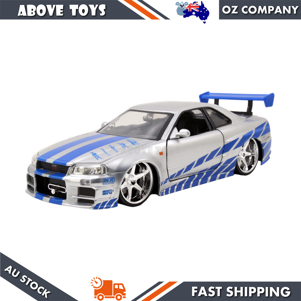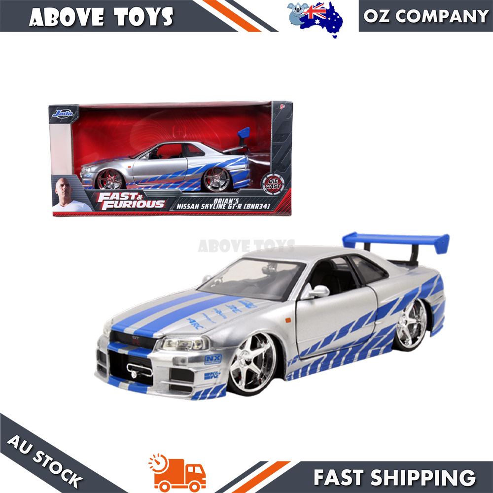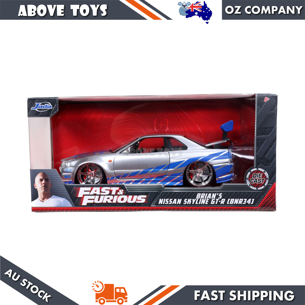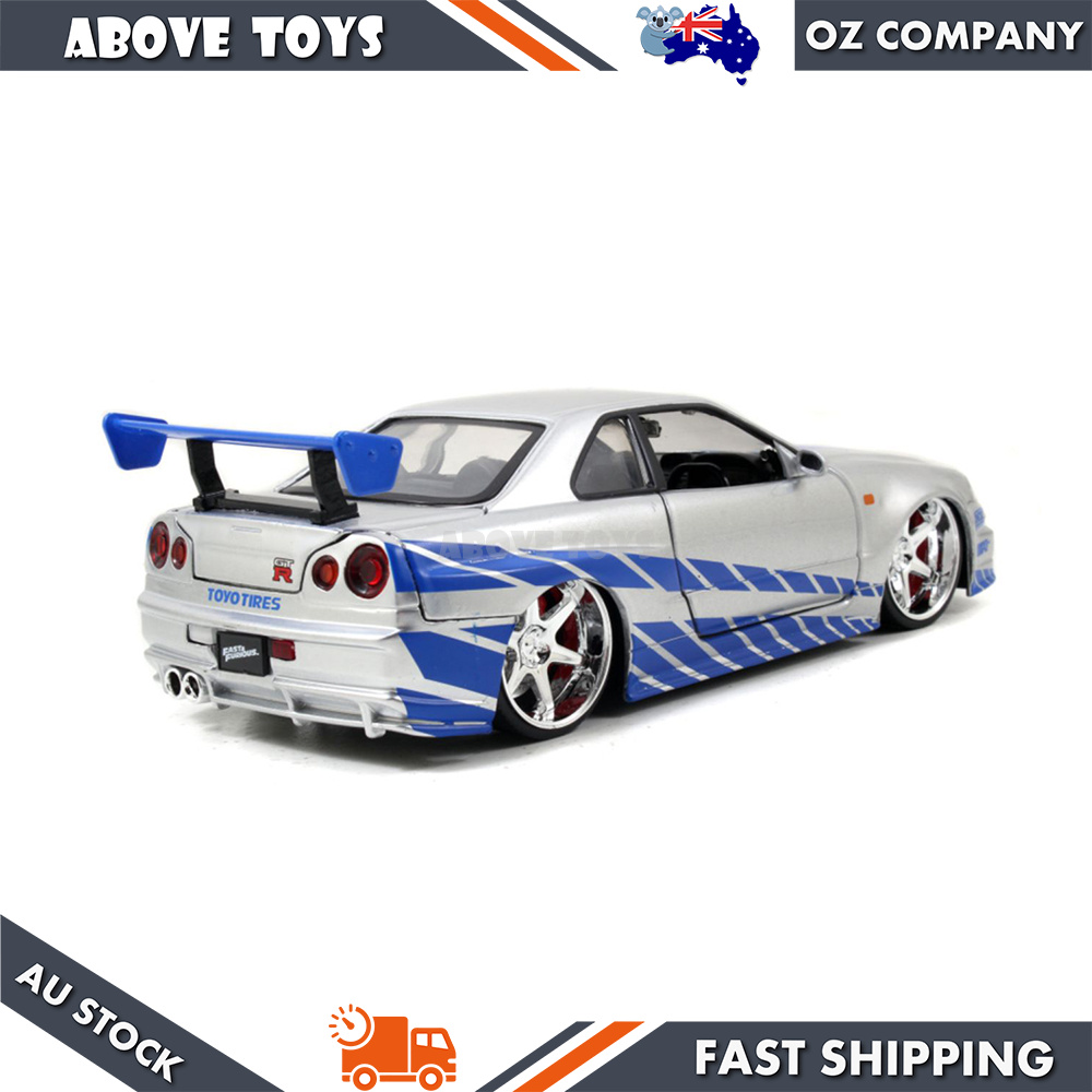 - Brand new 1:24 scale Brian's Nissan GTR Skyline R34 RHD (Right Hand Drive) Silver with Blue Stripes "Fast & Furious" Movie diecast model car by Jada
