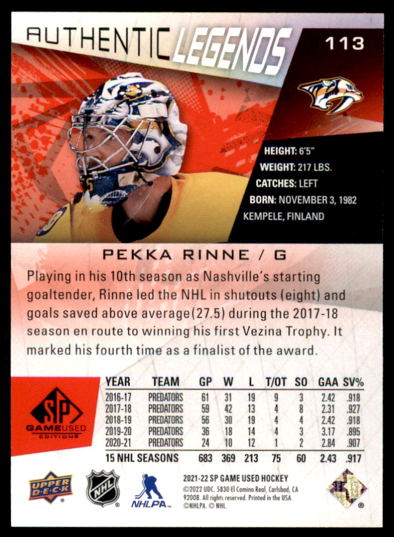 | Description: | Pekka Rinne | | Category: | Hockey | | Year: | 2021 | | Product: | SP Game Used Red Fragment | | Set: | 2021-22 Upper Deck SP Game Used | | Team: | Nashville Predators | | Card Number: | 113 | | Serial Number: | 46/205 | | Dimensions: | 3½" x 2½" |