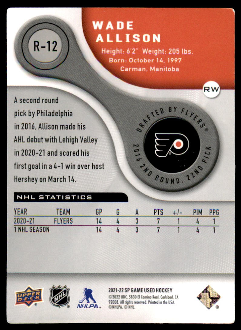 | Description: | Wade Allison | | Category: | Hockey | | Year: | 2021 | | Product: | SP Game Used 2005-06 Retro Rookies | | Set: | 2021-22 Upper Deck SP Game Used | | Team: | Philadelphia Flyers | | Card Number: | R-12 | | Rookie: | Yes | | Serial Number: | 833/999 | | Dimensions: | 3½" x 2½" |