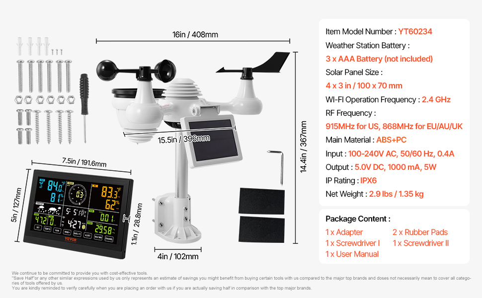 The solar-powered weather station has a 7-in-1 sensor that monitors wind speed, temperature and humidity, rainfall, etc. It transmits weather data in real time via a Wi-Fi connection, while the solar panel and Ni-MH battery provide long-lasting power. Get ready for any weather with the VEVOR!