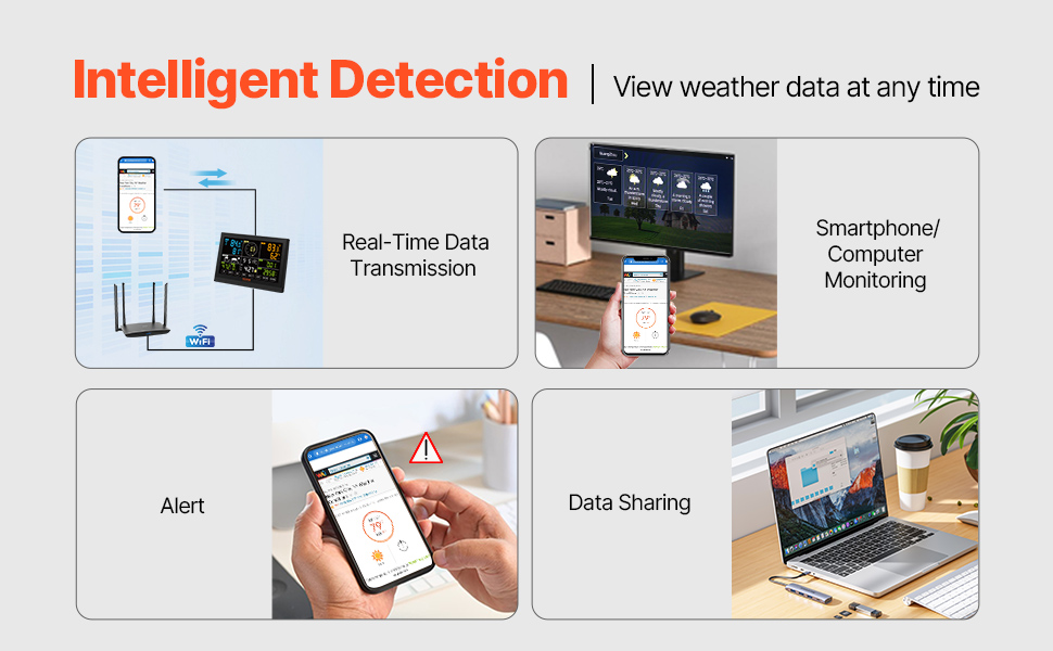 Through a WiFi connection, the wireless weather station performs real-time data transmission to your smartphone, tablet, or computer. You can get detailed information such as temperature, humidity, wind speed, and so on with just one touch.