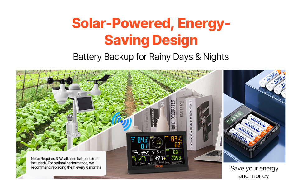 An Unbelievable Experience: The wireless home weather station is equipped with a 4 x 3 in/100 x 70 mm solar panel. The solar panel powers the device on sunny days, while batteries take over during nighttime or cloudy weather—helping reduce overall energy costs. The sensor adopts rechargeable Ni-MH batteries, avoiding frequent battery replacement. The aluminum rod fixed bracket supports the sensor during outdoor work for prolonged periods