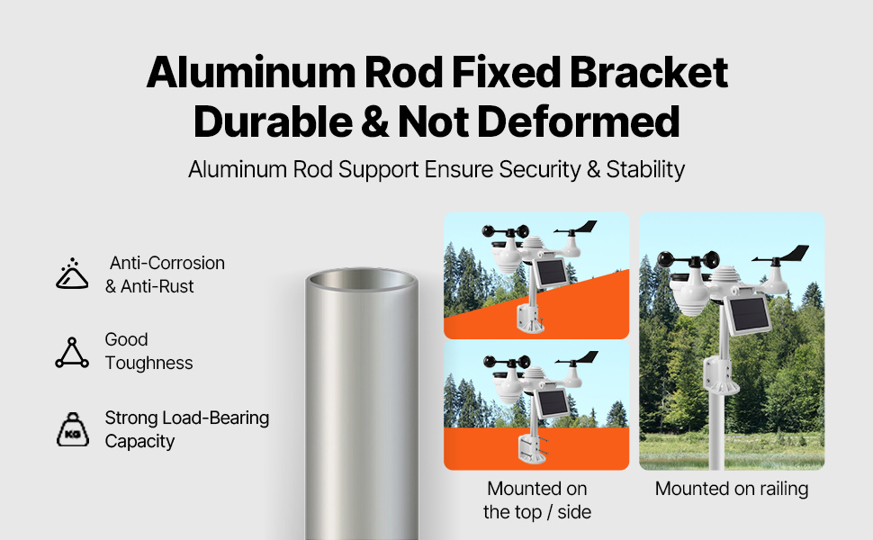 Our indoor outdoor digital weather station is equipped with an aluminum rod fixed bracket, which is anti-corrosion and rust-proof, fearless of harsh environments. It has a strong load-bearing capacity and is stable for mounting on the top, side, or on the railing.