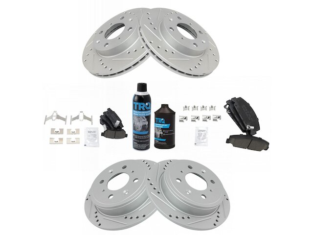 Package Contents: (2) Front Performance Brake Rotors; (2) Rear Performance Brake Rotors; (1) 12 oz DOT 3 & 4 Brake Fluid; (1) 13 oz Non-Chlorinated 50 State Formula Brake Cleaner; (1) Front Ceramic Brake Pad Set with Contact Point Grease & Hardware; (1) Rear Ceramic Brake Pad Set with Contact Point Grease & Hardware