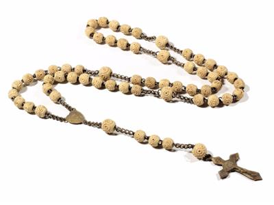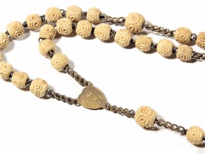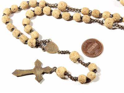 Vintage Deco Czech Bohemian religious Catholic 5 decade rosary with gold tone crucifix cross pendant, gold tone wire and very early carved floral beige plastic beads.