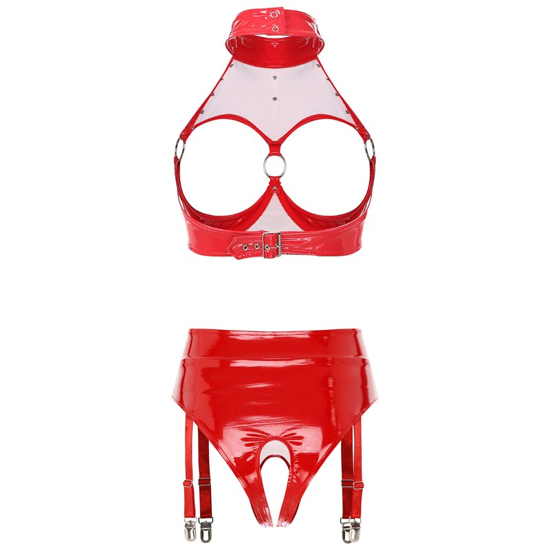 Matching high-waist and open crotch underwear, garter with clips for holding stockings to prevent slip off.
