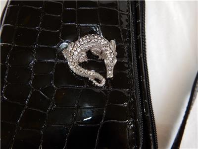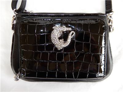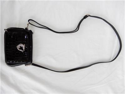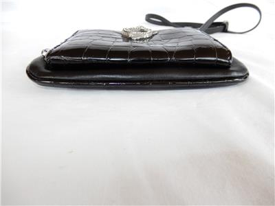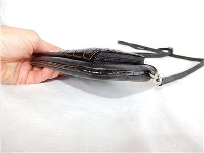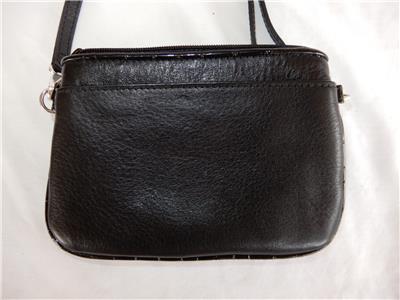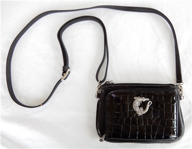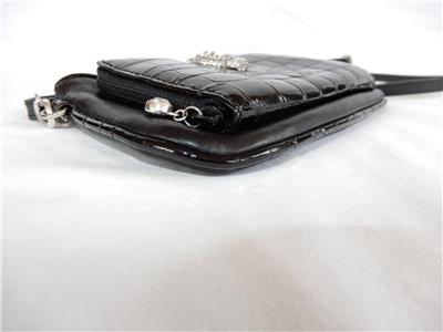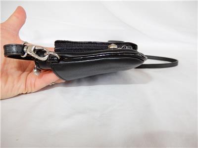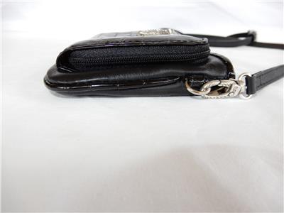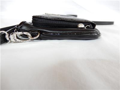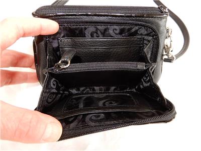 Black patent leather front pocket and around the trim with zip coin pocket, ID window and 2 credit card slots