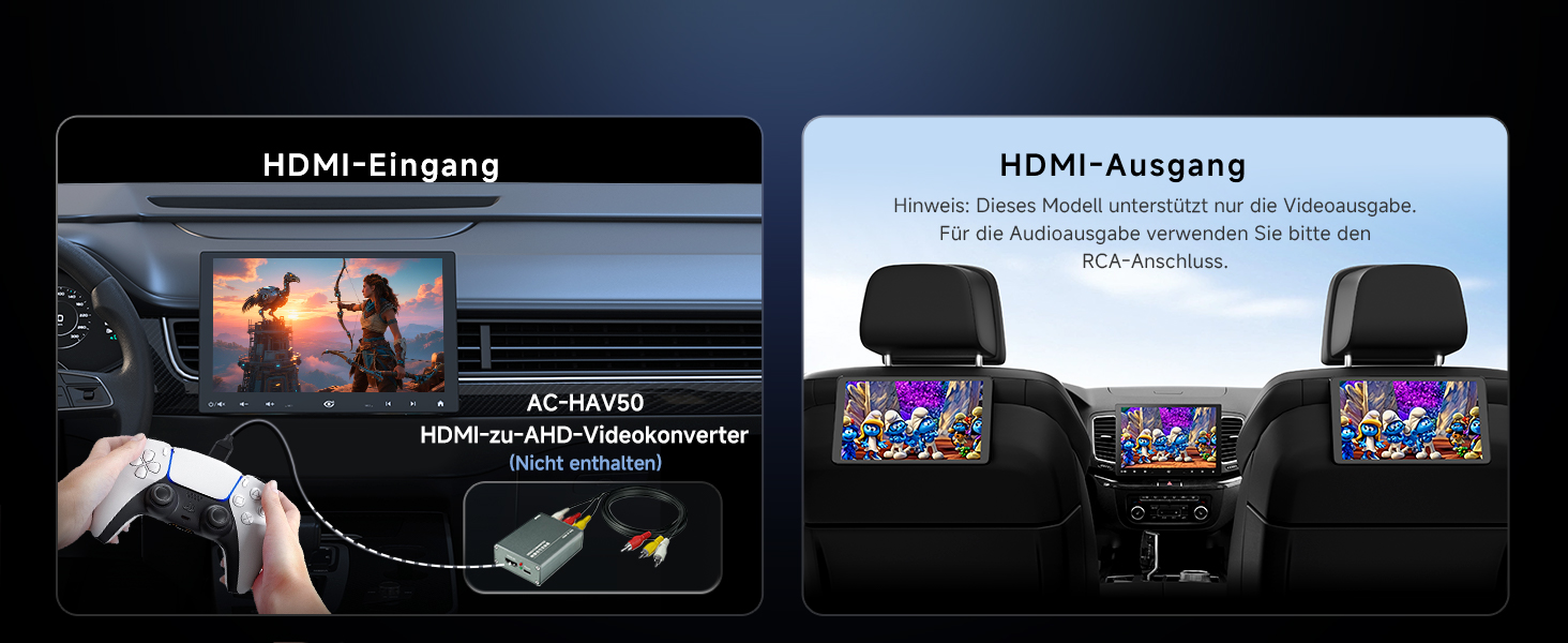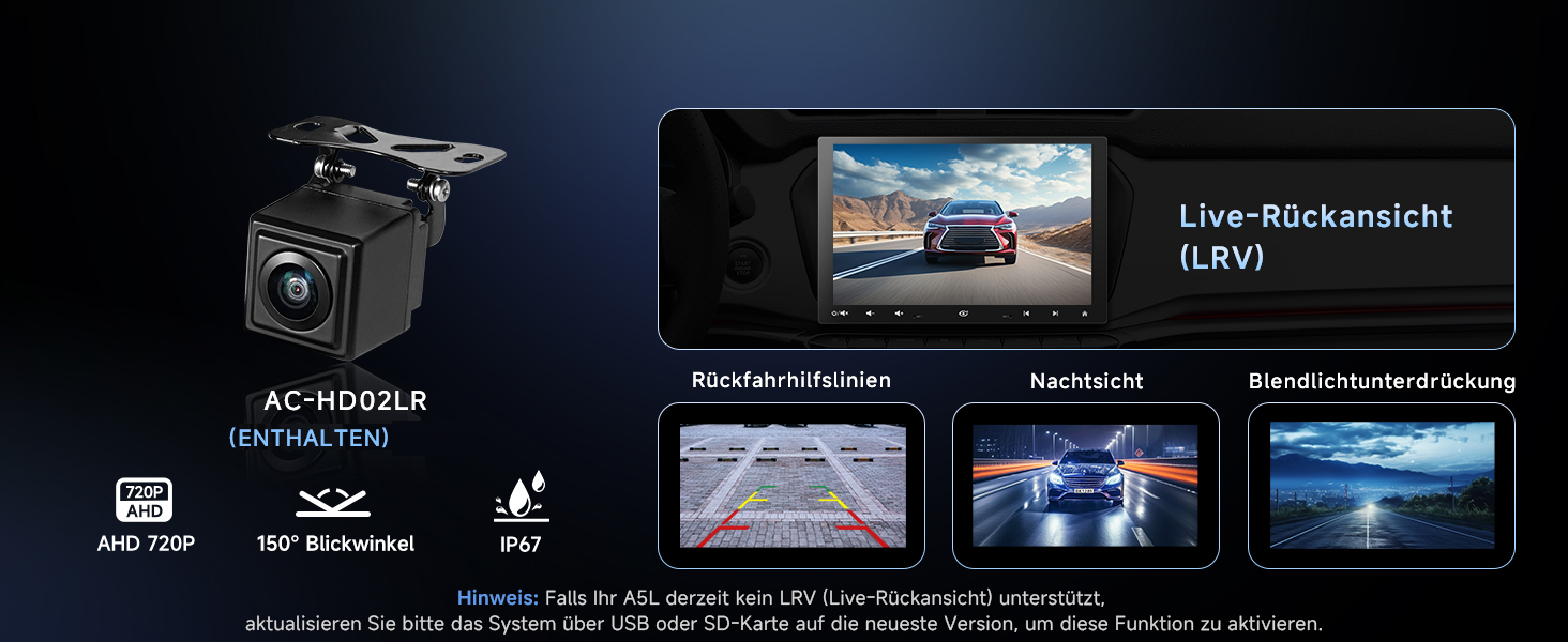 [Rückfahrkamera]: Bei Verbindung mit der AC-HD02LR (enthalten) bietet das System 720P AHD-Rückansicht mit Einparkhilfen, 150° Weitwinkel und Live-Rückansicht (LRV) für sicheres Parken