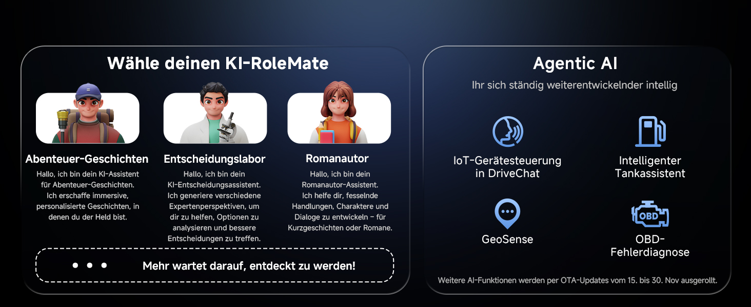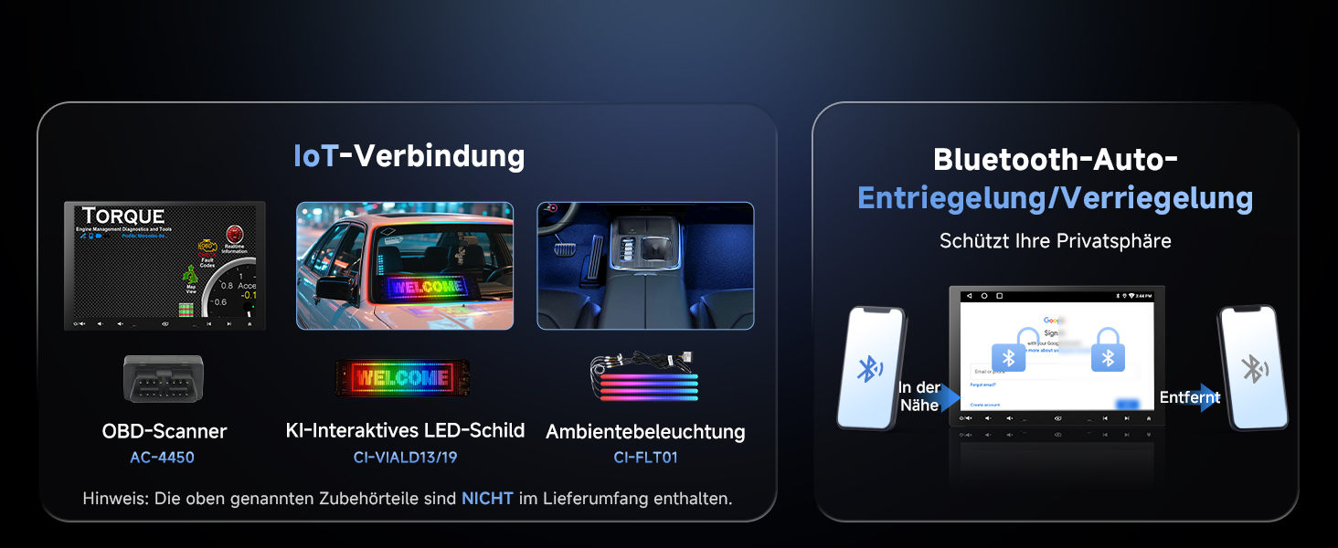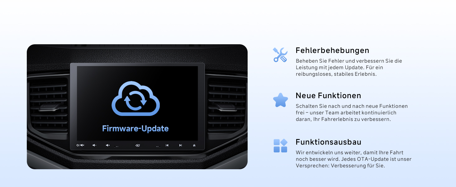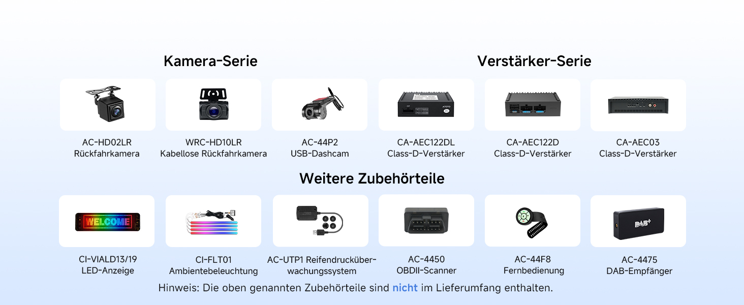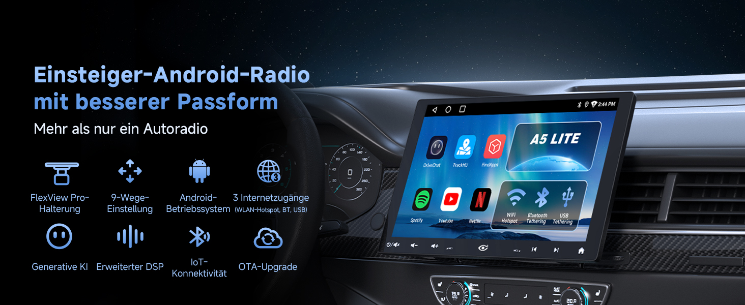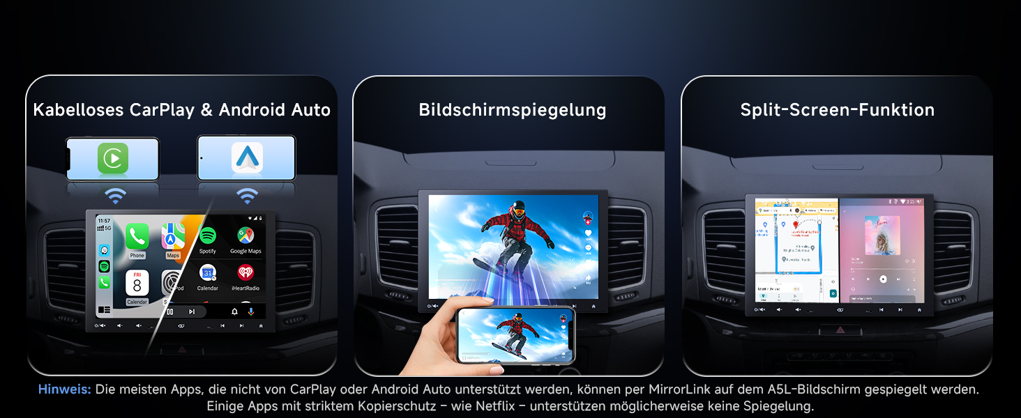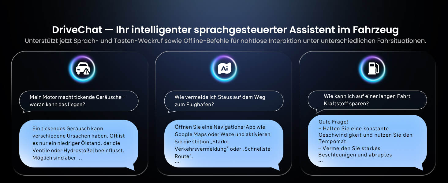 10,1" QLED (1280×800), 178° Blickwinkel, Floating‑Screen für große, klare Sicht 9‑Wege‑Halterung: seitlich, hoch/runter, H/V drehen, vor/zurück – blockiert keine Bedienelemente Android OS: Apps über Google Play; Internet via WLAN‑Hotspot, Bluetooth‑ oder USB‑Tethering DriveChat (ChatGPT): wechselbare Chatbots, anpassbare Weckwörter CarPlay & Android Auto: kabelgebunden/kabellos, Siri/Google Assistant für Navi, Musik, Nachrichten, Anrufe Audio: Verstärker 4×45W Peak/4×24W RMS, DSP, 24‑Band‑EQ, 9 Presets Bluetooth: verbindet Telefon und z. B. OBD‑Scanner, Musikstreaming parallel Rückfahrkamera: mit AC‑HD02LR 720P AHD, Einparkhilfen, 150° Weitwinkel, Live Rear View Produktpflege: 12 Monate; Support werktags rund um die Uhr; Online‑Handbuch