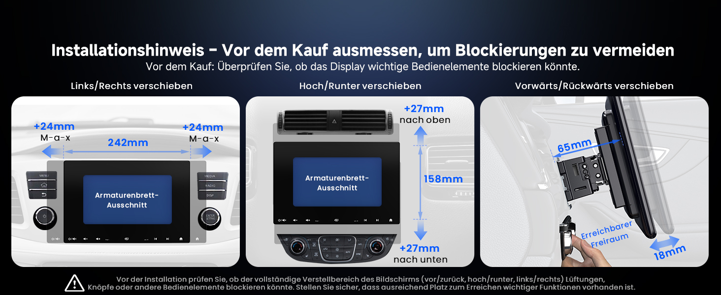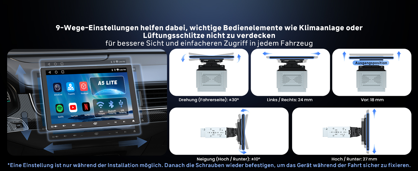 [Flexible einstellbare Halterung]: Bildschirm mit 9-Wege-Verstellung anpassen – seitlich, auf/ab, horizontal/vertikal drehen, vor/zurück ziehen. Verhindert das Blockieren wichtiger Bedienelemente wie Klimatasten oder Lüftungsschlitze