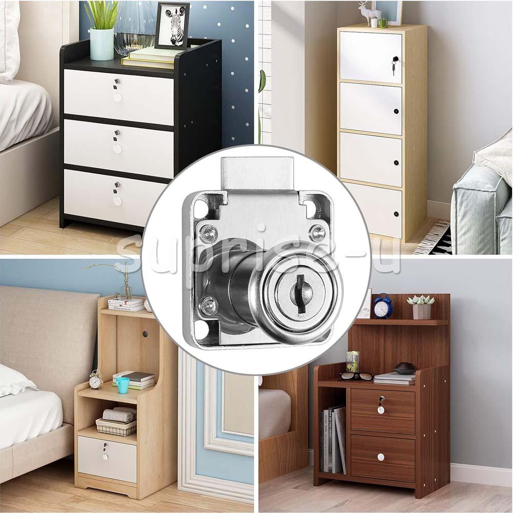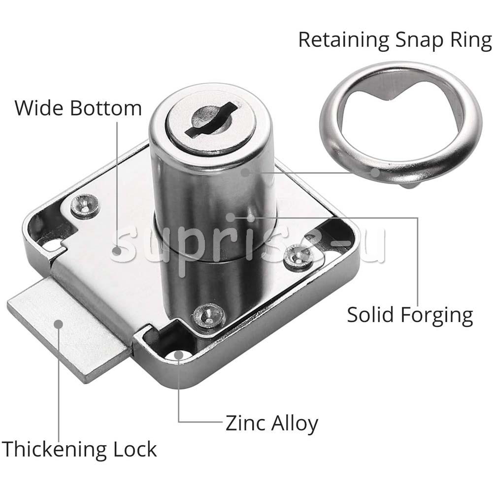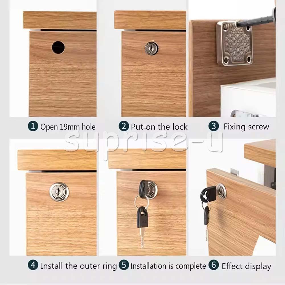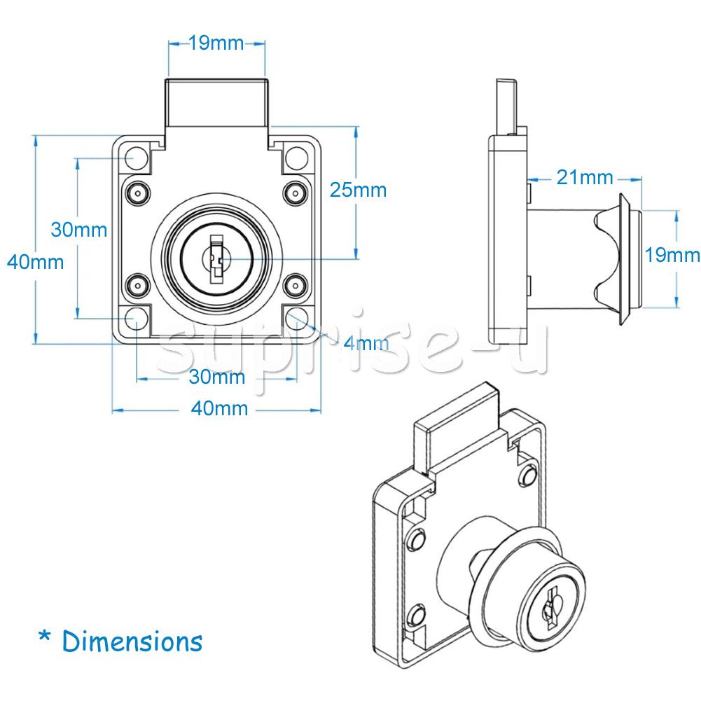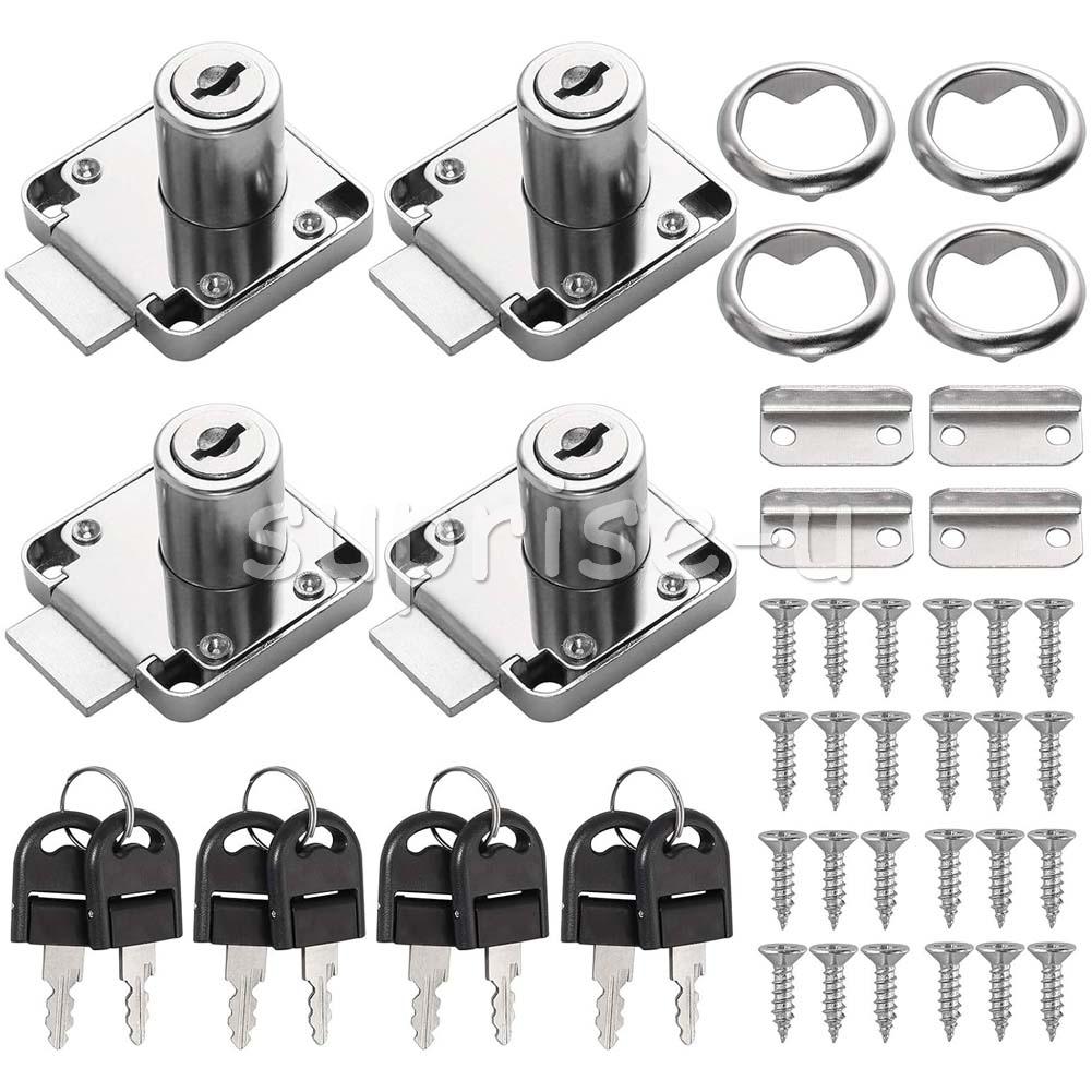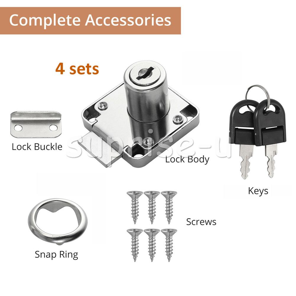 Use: Widely used in desk drawers, glove boxes, toolboxes, electrical cabinets or other safety supplies. Specification: Material: Zinc alloy Colour: Silver Size: 40x40mm Cylinder length: 21 mm, Cylinder diameter: 19 mm Type: Drawer Lock Lock type: key Suitable for drawer thickness: 20-28mm Package Included: 4 x Furniture Locks 4 x Lock Buckles 4 x Snap Rings 24 x Screws 8 x Keys (each lock has different keys)