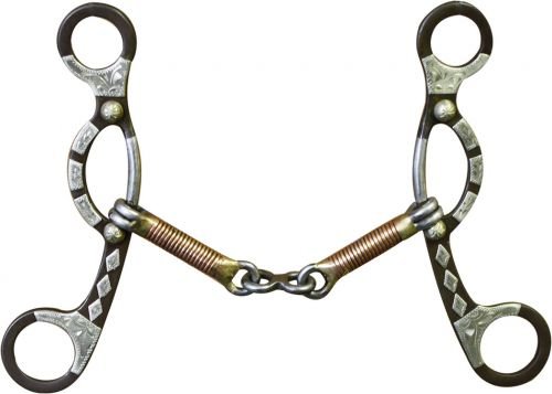 Showman Brown Steel Sliding Gag Bit w/ Engraved Silver Accents. This bit features brown steel 7" cheeks with engraved silver accents. Stainless steel 5 1/2" three piece copper wrapped dogbone snaffle mouth. For an average full size horse.