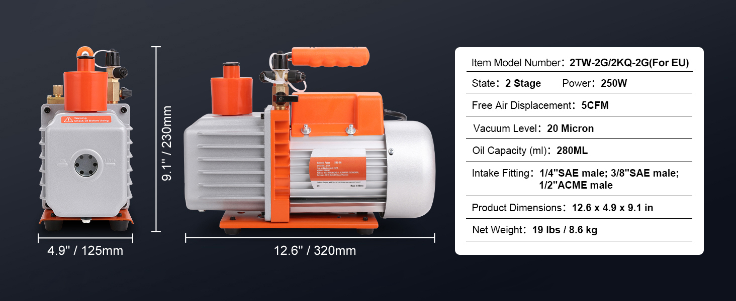 - Powerful Vacuum Pump: Experience top-notch performance with our 4 pole pure copper motor! Designed with high torque, you can count on its reliable performance and efficient operation. Flow Rate: 3.5 CFM; Ultimate Vacuum: 40 microns; Inlet: 1/4" SAE male, 1/2"ACME male; Voltage/Frequency: 120V/ 60 Hz, Oil Capacity: 250 ml.