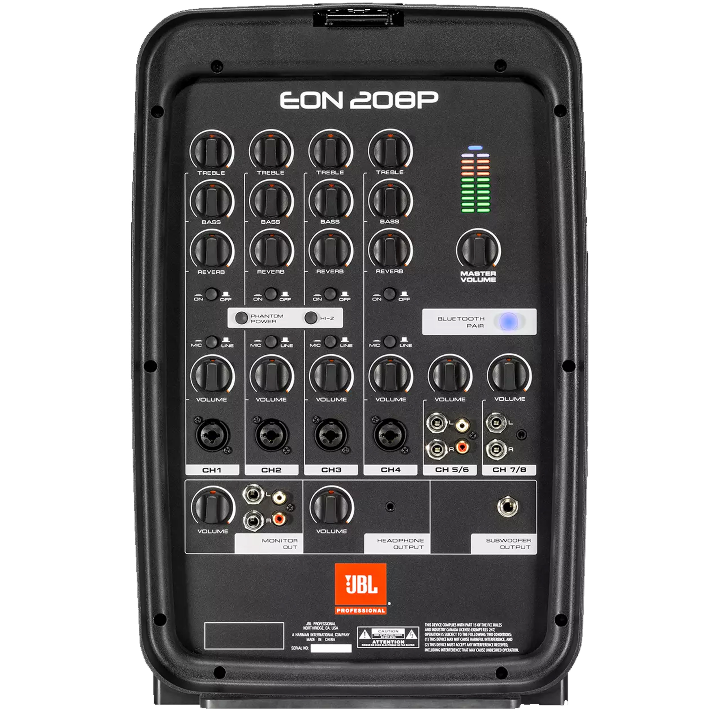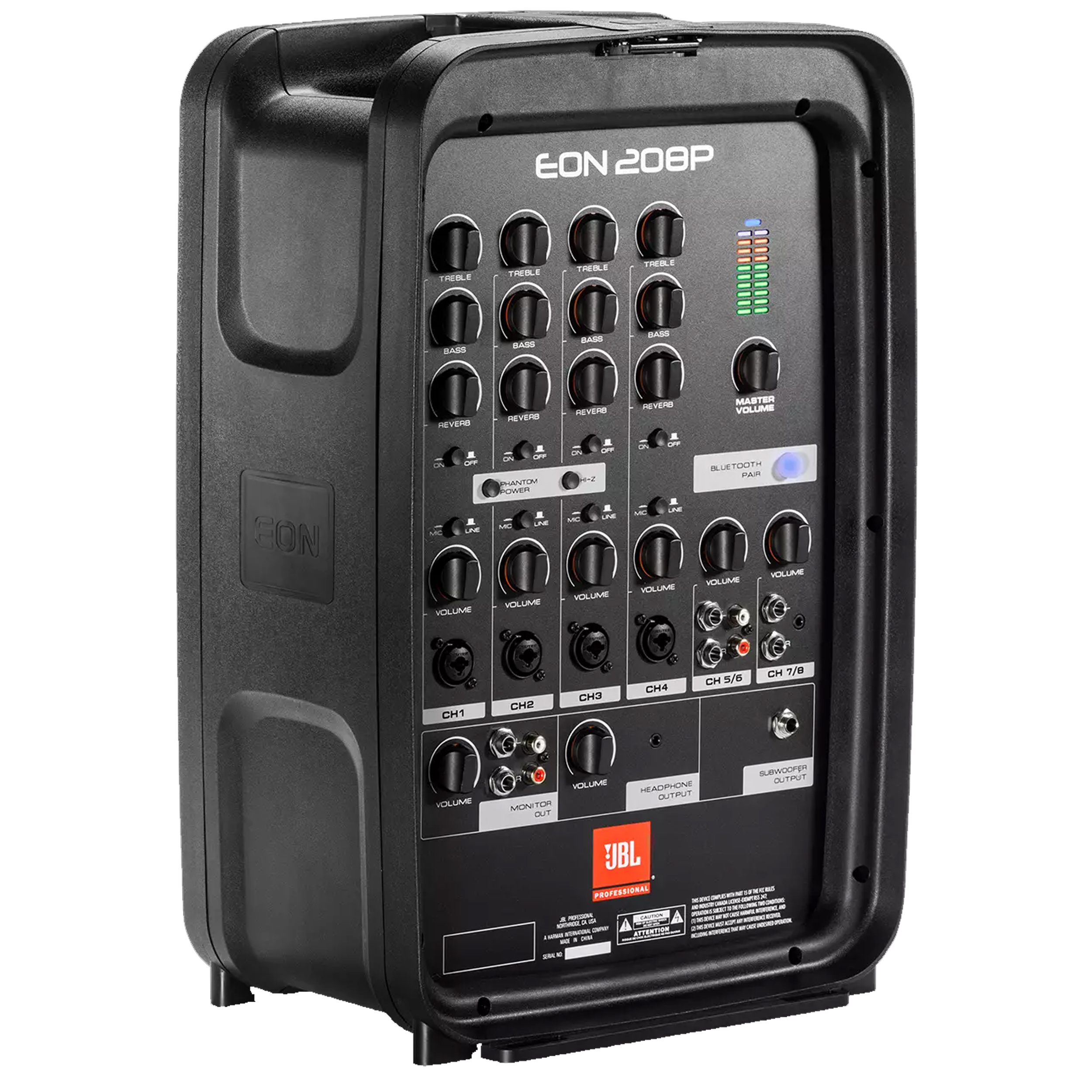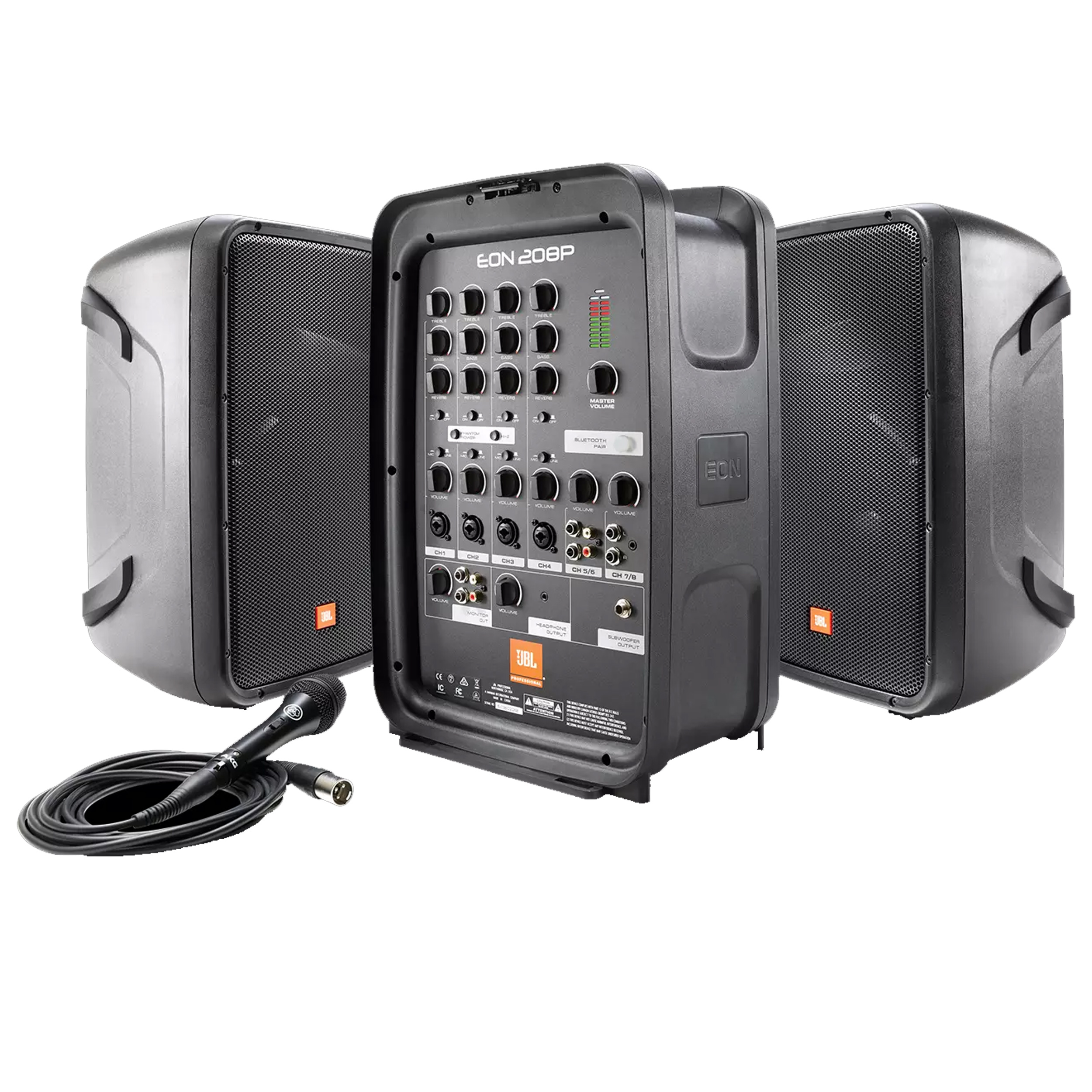 Bring legendary JBL sound quality to your stage with the EON208P all-in-one portable PA system. Featuring a convenient suitcase-style design, the EON208P makes it easy to get great sound for performances, meetings and events. The 8-channel detachable mixer provides professional connections for mics, instruments and line-level sources, while the 8" two-way stereo speakers deliver best-in-class audience coverage. Bluetooth connectivity allows you to stream audio from your mobile device. Thanks to 300 watts of power, you'll have enough volume to be heard loud and clear. Plus, the compact and lightweight form factor makes transportation easy-you can carry the entire system with one hand.