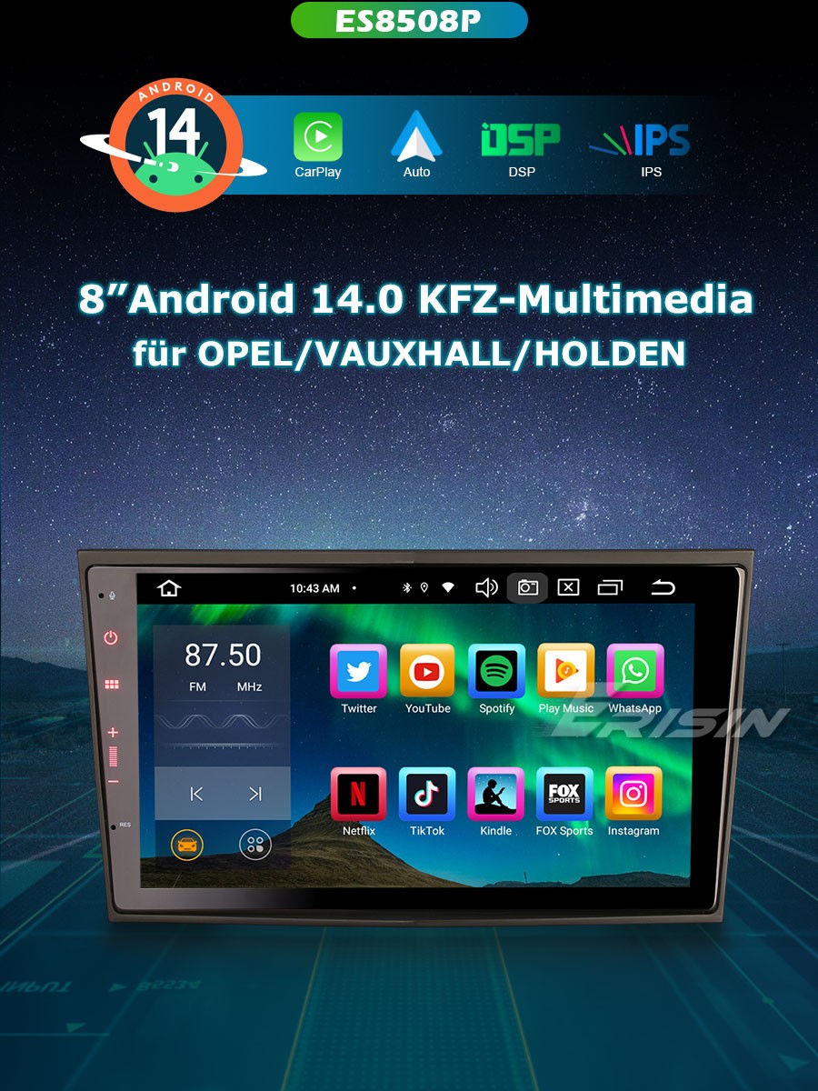 ES8508P 8" Acht-Kern Android 14.0 Auto Multimedia System CarPlay & Auto GPS TPMS/DVR/DAB+/DTV-IN...