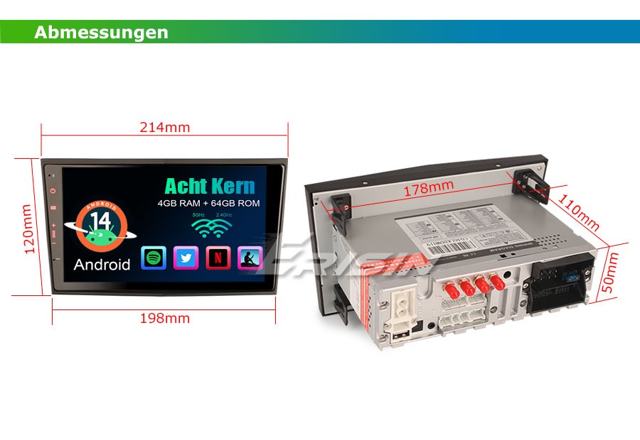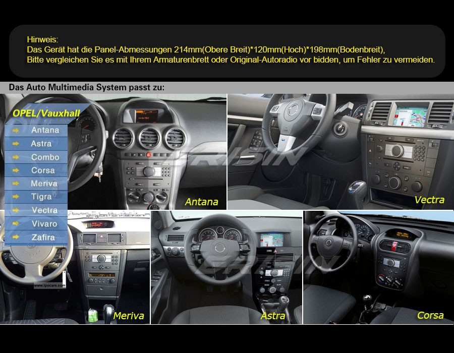 Bitte lesen Sie hier die Panel-Abmessungen von 214mm(Obere Breit)*120mm(Hoch)*198mm(Bodenbreit) und vergleichen Sie es mit Ihrem Armaturenbrett oder Original-Media-Player vor bidden, um Fehler zu vermeiden.