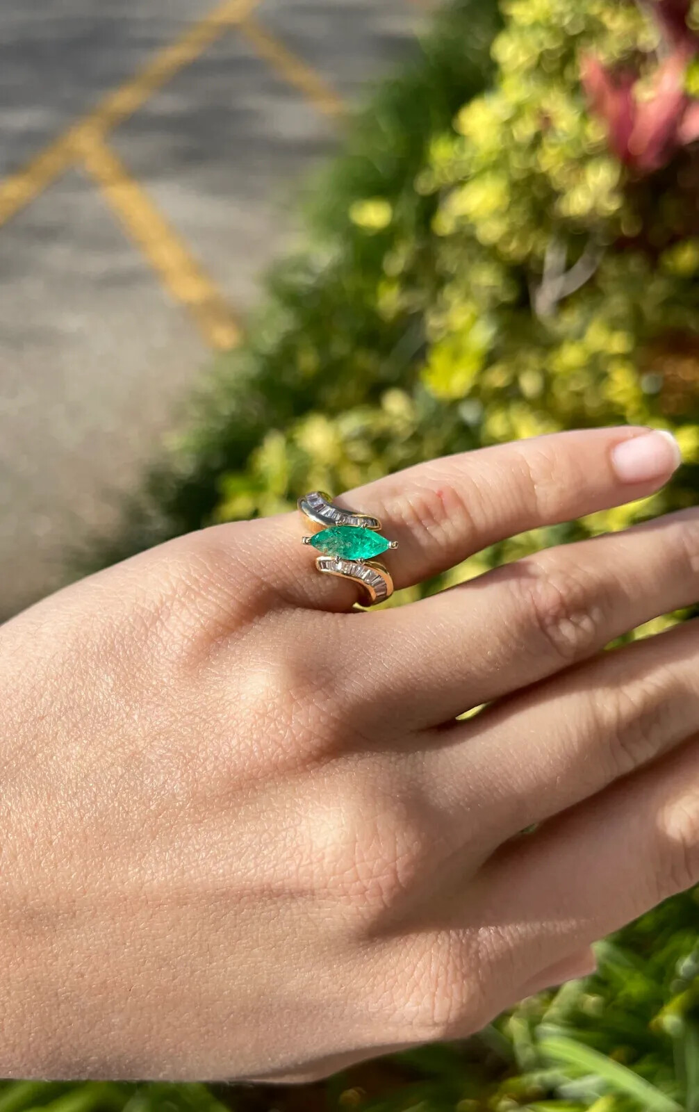 Displayed is a stunning emerald marquise and diamond cocktail ring. The center gemstone is a gem quality emerald marquise handset in a six prong setting that allows for a full view of the emerald. The gemstone has great facets, excellent shine, and good eye clarity. The gem has a lustrous medium green color and radiating luster. Baguette diamonds are channel set on the shank of the ring and cover the entire finger width. The diamonds catch the light beautifully and exhibit excellent sparkle. This cocktail ring must be seen in person to be fully appreciated!