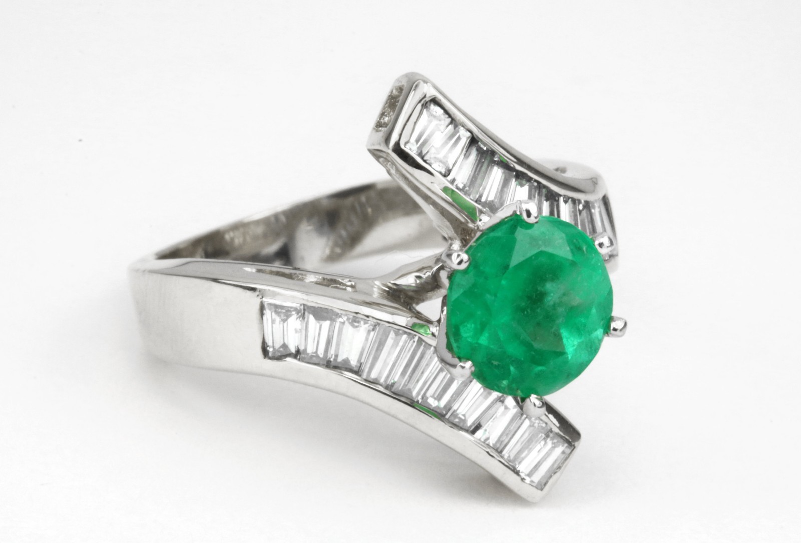 Displayed is a spectacular round Colombian emerald and diamond baguette cocktail ring 14K. Set in 14k yellow gold, the sublime emerald weigh a perfect 1.70-carats and is set alongside brilliant white baguette diamonds in an elegant bypass channel setting. A gorgeous rich green color is showcased in the emerald with beautiful clarity. Elegantly held, a six-prong setting securely holds the genuine gemstone. The diamonds are all bright and dance under all light settings!