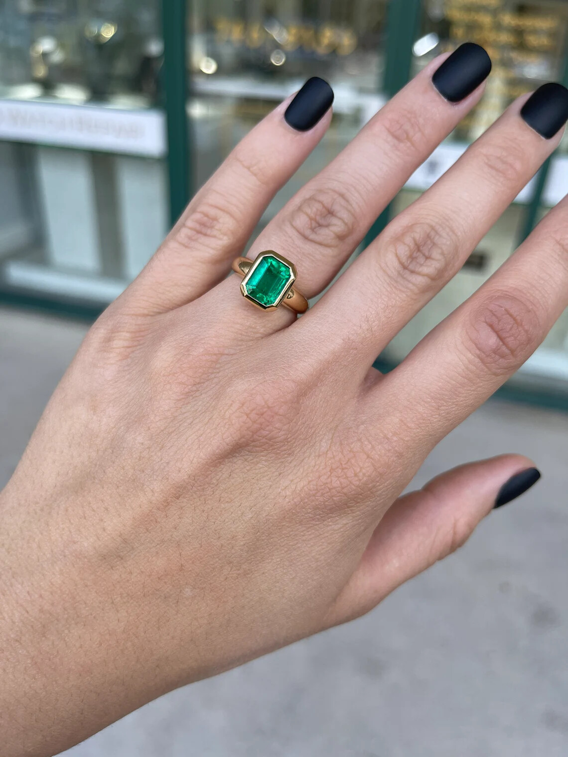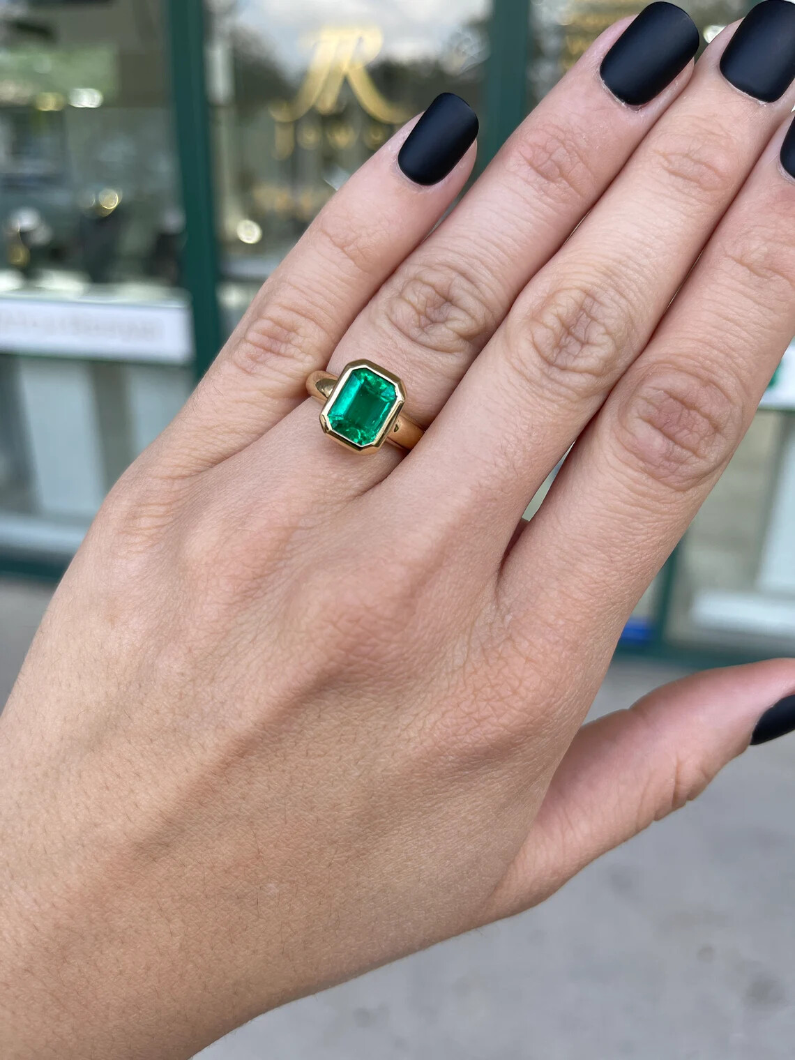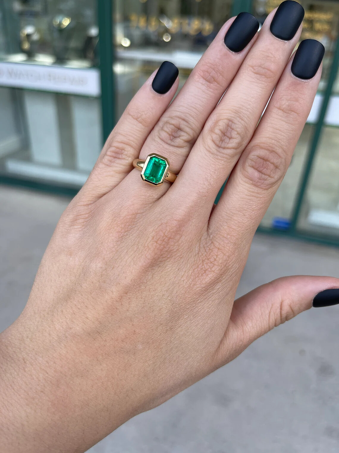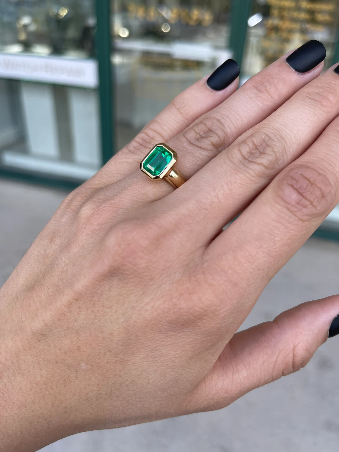 A remarkable, AAA+ emerald solitaire engagement ring. A 3.92-carat, natural emerald cut Colombian emerald with superb qualities. This extremely rare fine gemstone is considered the top 1% of gem production in the global emerald market. A gemstone so beautiful it needs no accents, as it speaks for itself. The emerald has a vivacious vivid dark green color, with a yellowish-green hue that intensifies at every glance. Carefully bezel set for the most protection in gleaming 18K yellow gold. A true heirloom and investment piece.