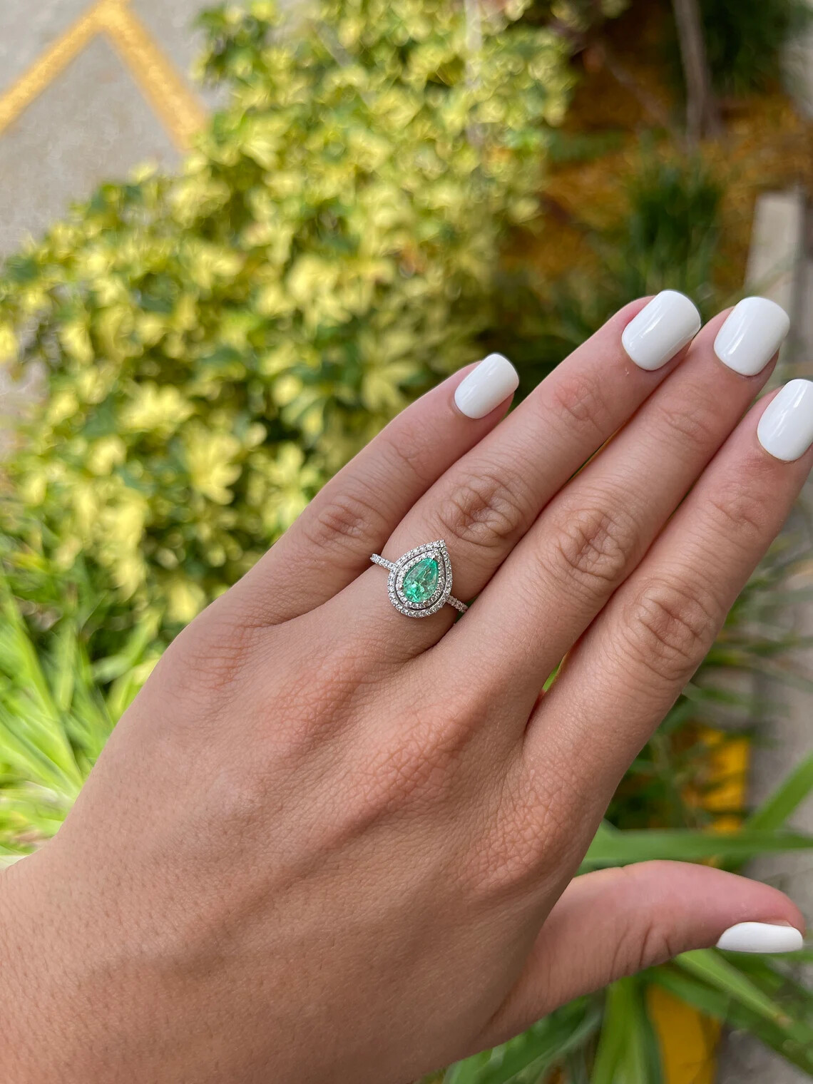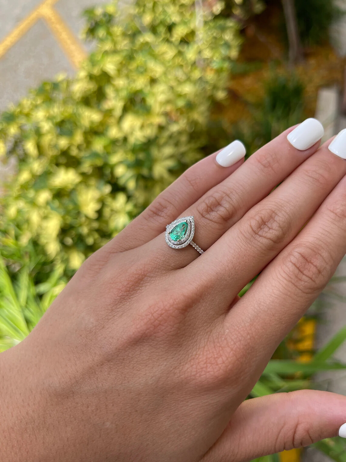 Elegantly displayed is a Colombian emerald and diamond double halo engagement ring. The center gem is filled with life and brilliance! Among the impressive qualities of the emerald, vivacious medium green color and very good eye clarity are seen. The gem is very clean to the eye although small Jardins do exist, small imperfections are normal in genuine stones and allow each stone to be unique! Numerous round diamonds are firmly pave set in this piece, covering the entire width of the ring with wonderful, radiant sparkle. The side diamonds are bright near colorless. In addition to their gorgeous bright white luster, the diamonds halo around the emerald exposing beautiful sparkle and life. The ring is made in 14k white gold. The ring sits low but is easily paired with any band!