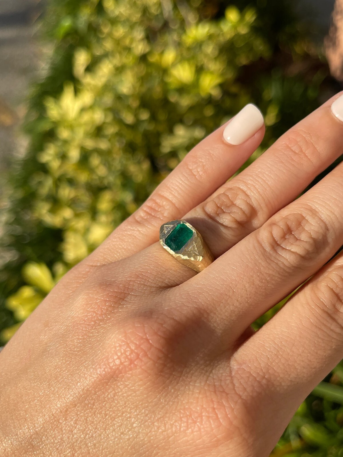 This exquisite three stone ring features a fine quality Zambian emerald as its center stone, bezel set vertically for a modern and sophisticated look. Two trillion cut diamonds are set on either side of the emerald, adding a touch of sparkle and contrast to the rich green color of the stone. The ring is crafted from 14k gold with a matte hammered finish, giving it a unique and textured appearance. This ring is a beautiful and timeless piece that will make a stunning addition to any jewelry collection.