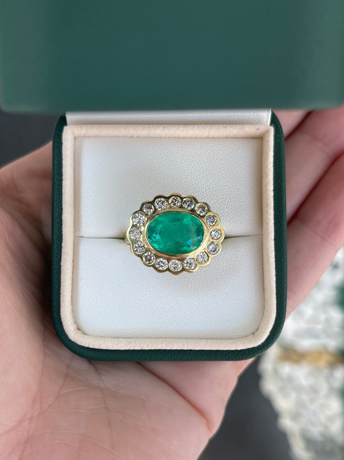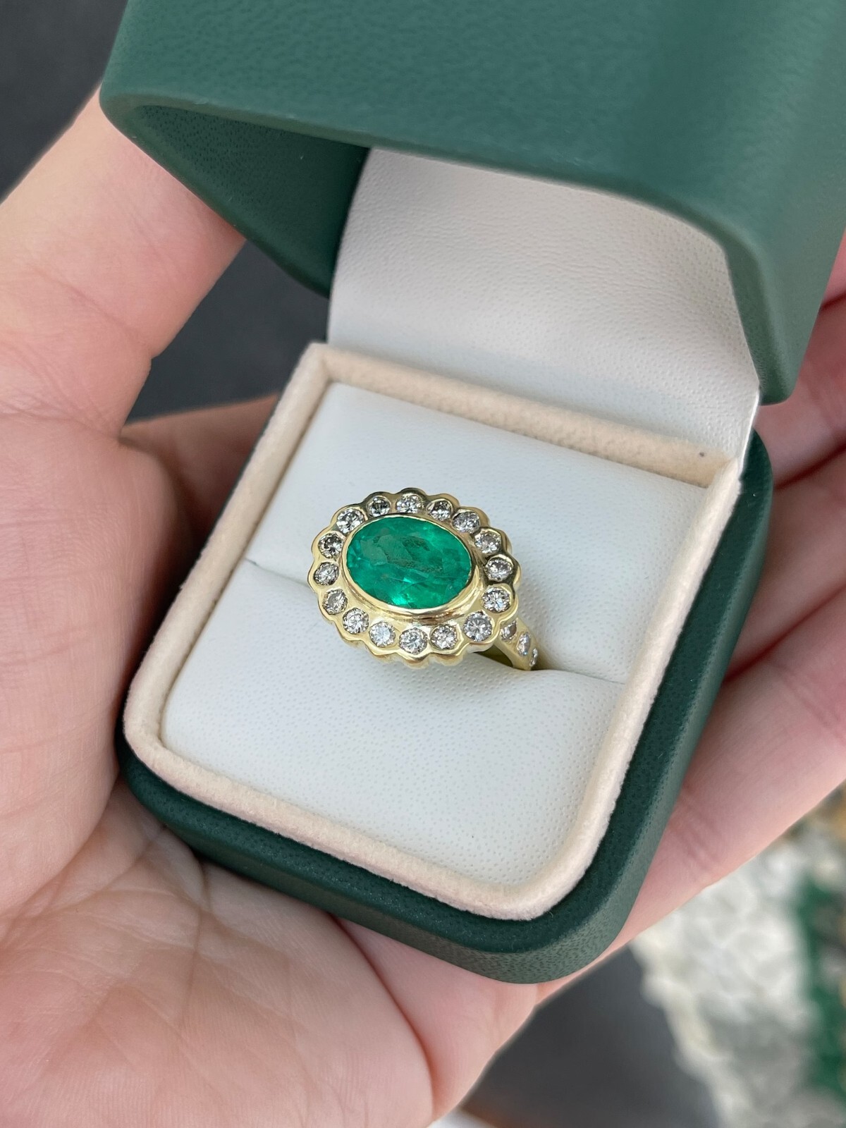 This stunning ring features a Colombian emerald of exceptional quality, cut into an elegant oval shape and set in 18k gold. The rich, dark green color of the emerald is truly vivid and eye-catching. The center stone is surrounded by a sparkling halo of brilliant round cut diamonds that accentuate its beauty and add a touch of glamour. The shank of the ring is also adorned with diamonds that create a stunning floral design halfway around the band. Crafted with exquisite attention to detail and using only the finest materials, this ring is sure to impress and make a statement.