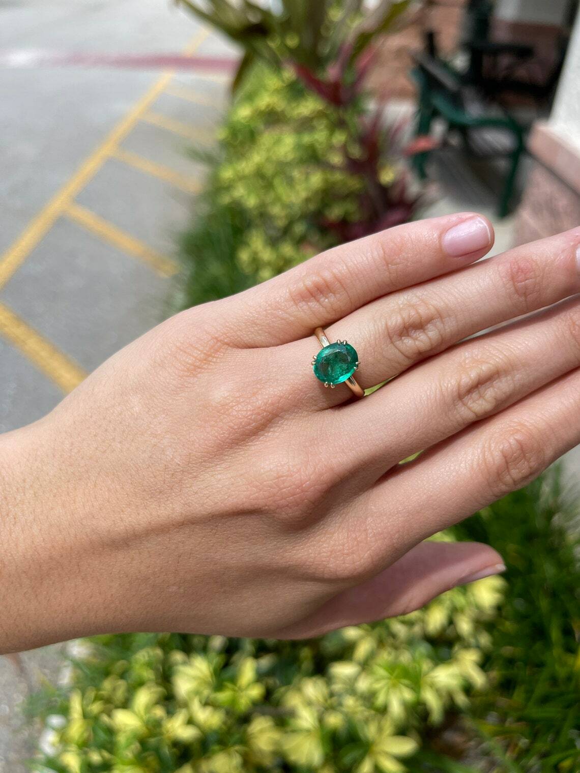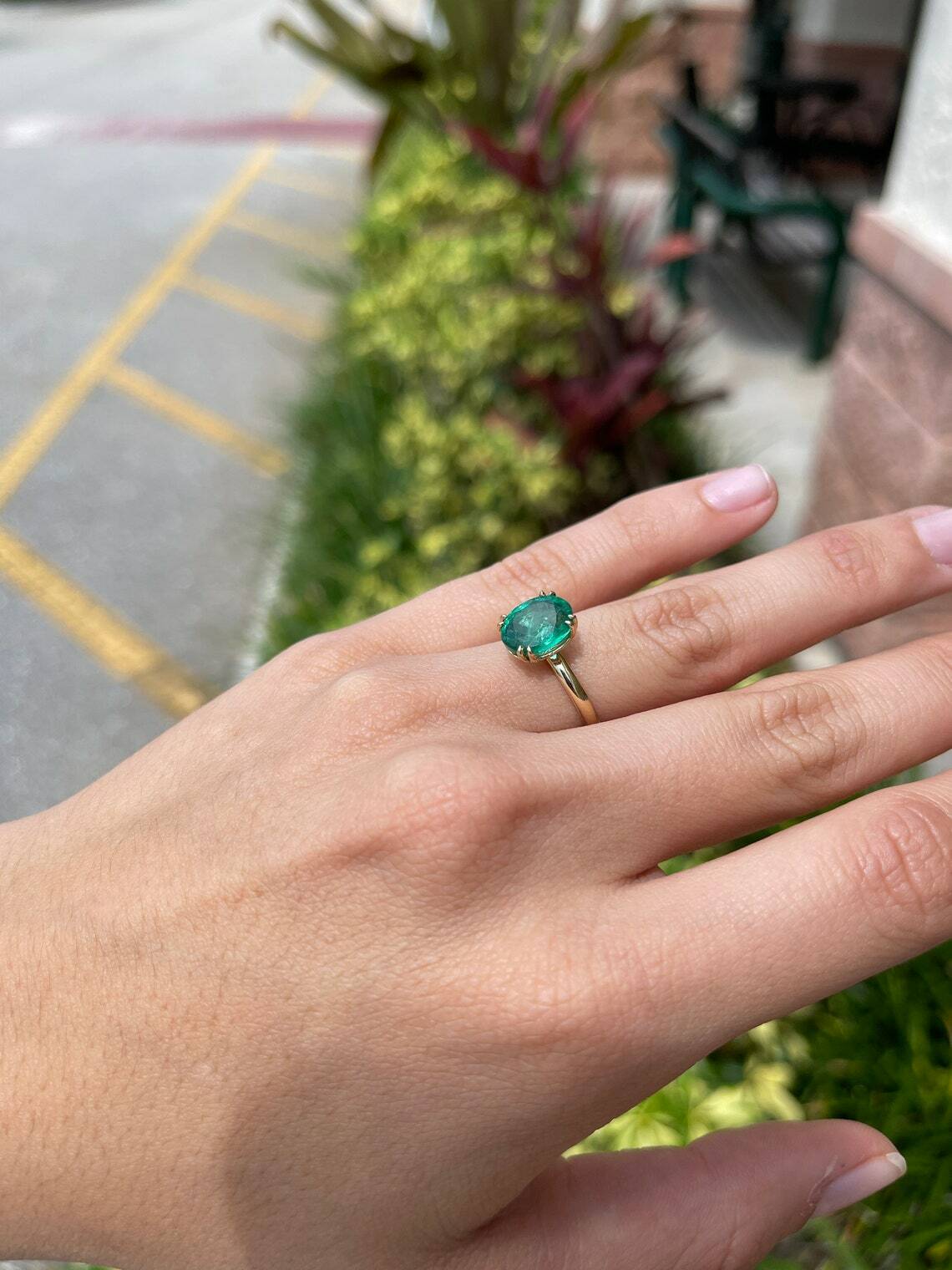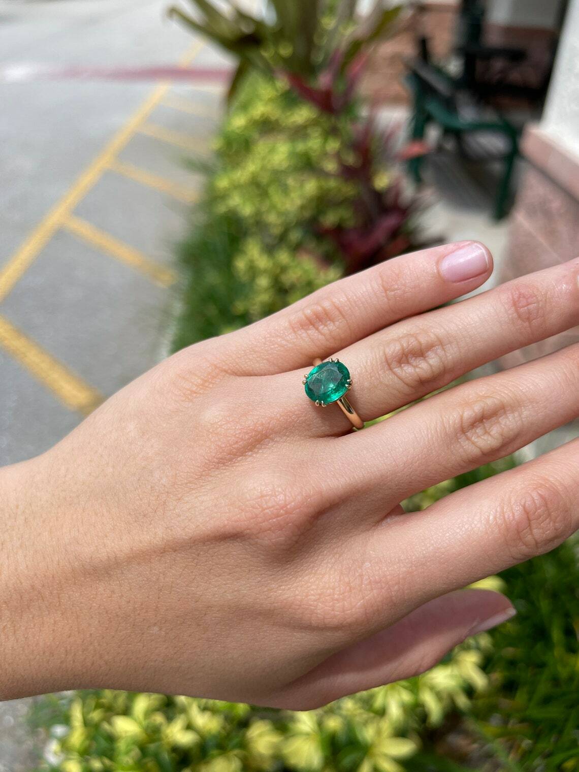 Displayed is a custom emerald solitaire oval-cut engagement/right-hand ring in 14K yellow gold. This gorgeous solitaire ring carries a 3.25-carat emerald in a 4, double prong setting. The emerald has very good clarity with minor flaws that are normal in all genuine emeralds. The gem has a beautiful green color and excellent luster. An ideal solitaire, perfect for everyday use!