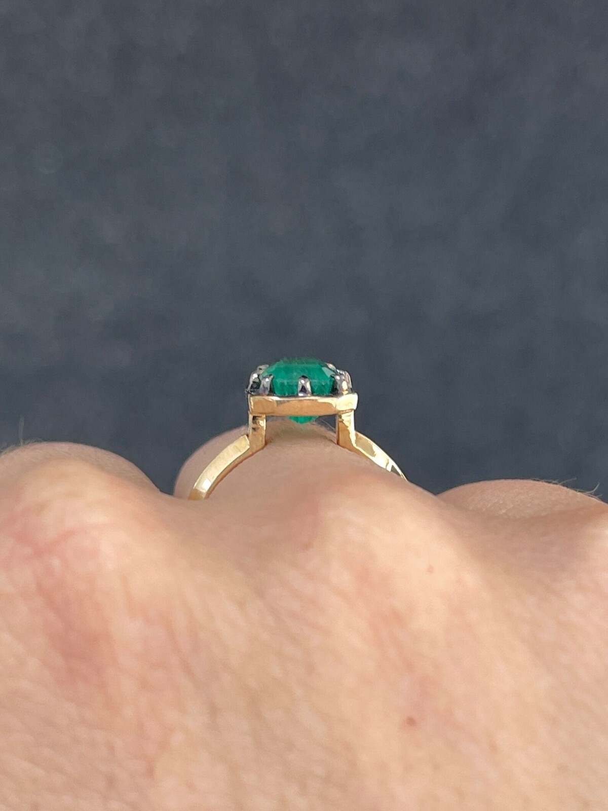 Displayed is an elegant, natural emerald solitaire emerald-cut engagement ring/right-hand ring in 14K yellow gold, with a black rhodium rim. This gorgeous solitaire ring carries a full 2.32-carat Zambian emerald in an eight-prong Georgian/collet setting. Fully faceted, this gemstone showcases excellent shine. The emerald has very good clarity and luster, followed along by its remarkable green color; with minor flaws that are normal in all genuine emeralds! This ring was custom designed by us to allow bands to easily stack along with it.